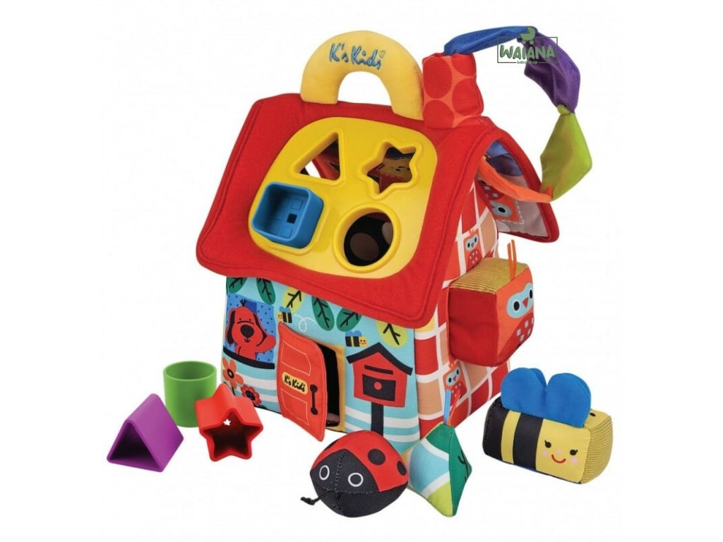 Domček: S mäkkými stenami, ktoré majú otvory v rôznych tvaroch na prispôsobenie kociek.Strecha domčeka: Obsahuje otvory v tvaroch trojuholníka, hviezdy, kruhu a štvorca, ktoré slúžia na precvičovanie jemnej motoriky.Mäkká chlopňa s postavičkou Psíka Patrika: Obsahuje aj bezpečné zrkadielko, v ktorom sa dieťa môže pozorovať.Veľká rukoväť: Umožňuje dieťaťu hračku ľahko prenášať.