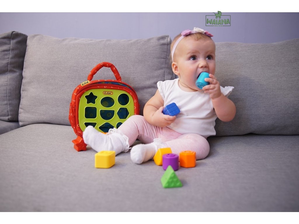 Táto interaktívna hračka pre deti rozvíja motorické zručnosti, logiku a kreatívne myslenie prostredníctvom hry s farebnými blokmi. Hádzaním a triedením kociek sa dieťa učí tvary, rozvíja koordináciu oko-ruka a získava pocit pre poriadok, keď bloky vkladá späť do tašky. Praktická rukoväť umožňuje ľahké prenášanie, čo dieťaťu umožňuje vziať si hračku so sebou kamkoľvek.