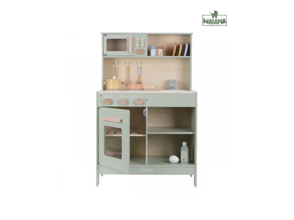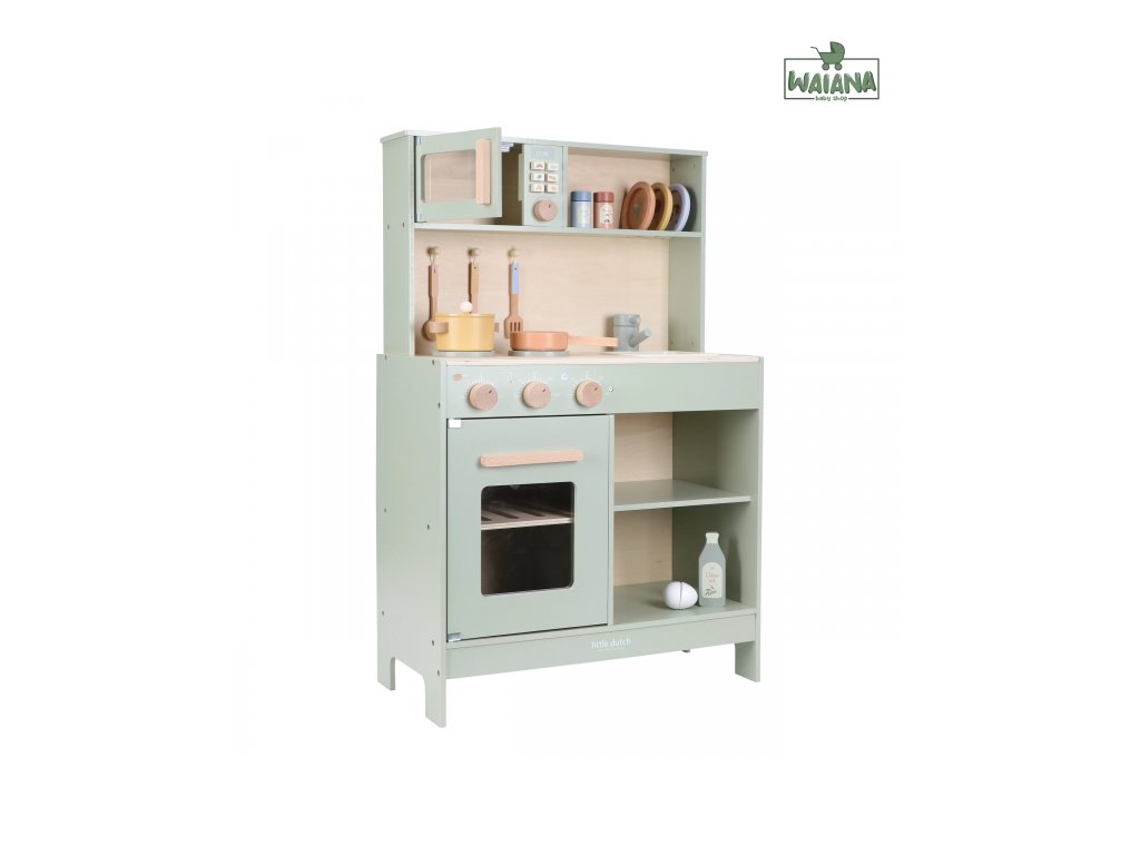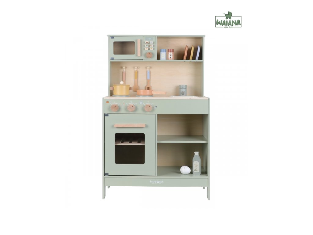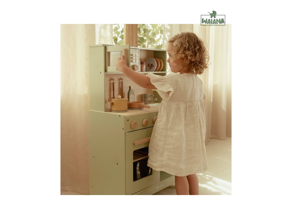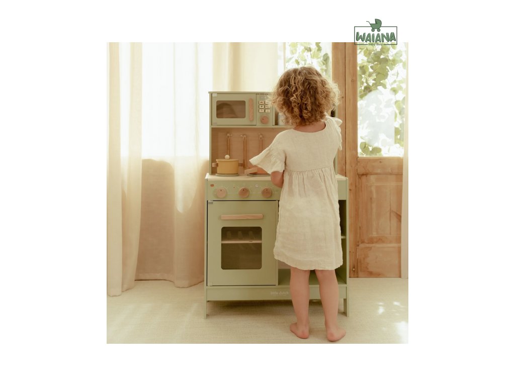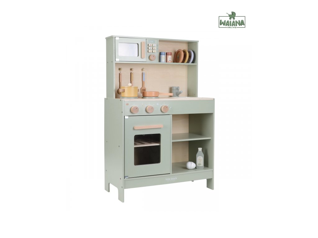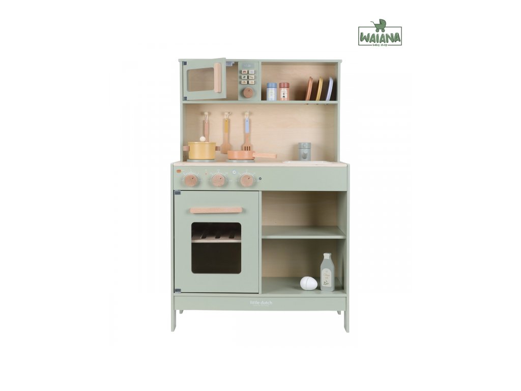 Krásna drevená kuchynka Little Dutch ponúka všetko, o čom malý kuchár či kuchárka sníva, keď vymýšľa nové recepty pre rodinu či svoje bábiky a obľúbené plyšáky. S panvicou, hrncom, tromi tanierikmi a sadou kuchynského náčinia nie je problém pripraviť niekoľko chodov naraz. Rúra upečie koláč, na sporáku sa uvarí zelenina, mikrovlnka rýchlo ohreje, čo je potrebné. K dispozícii je aj olivový olej, vajíčko, soľ a korenie na dochutenie. Po práci si kuchár umyje ruky v dreze. Skrinka ponúka priestor na uloženie potravín.