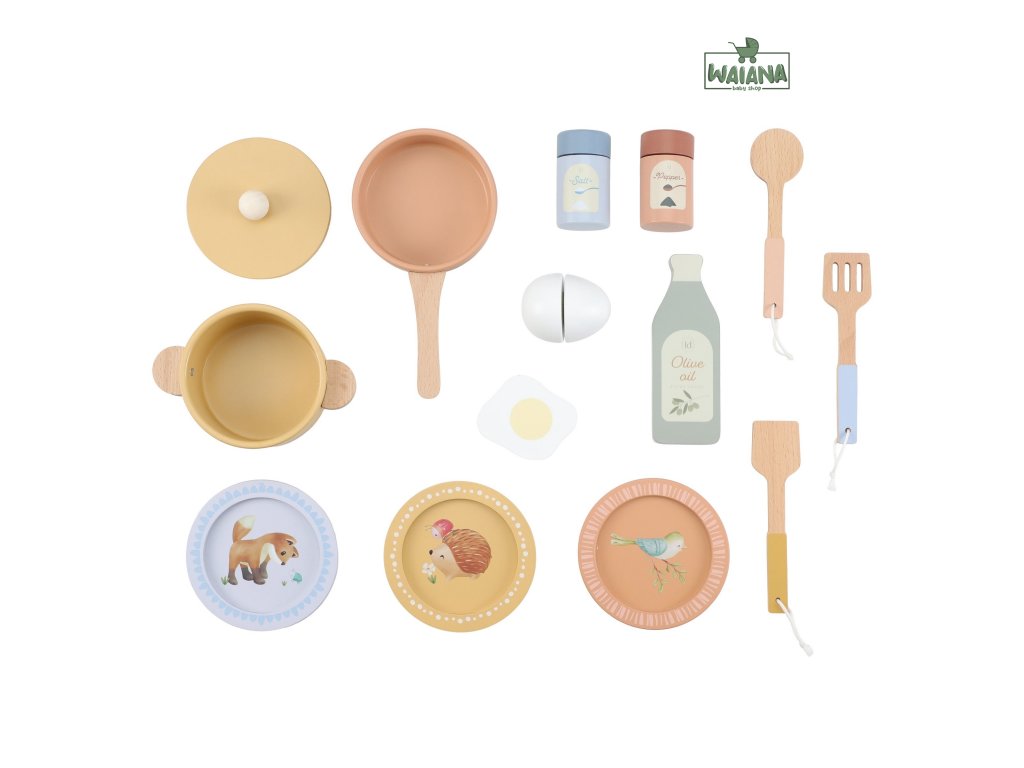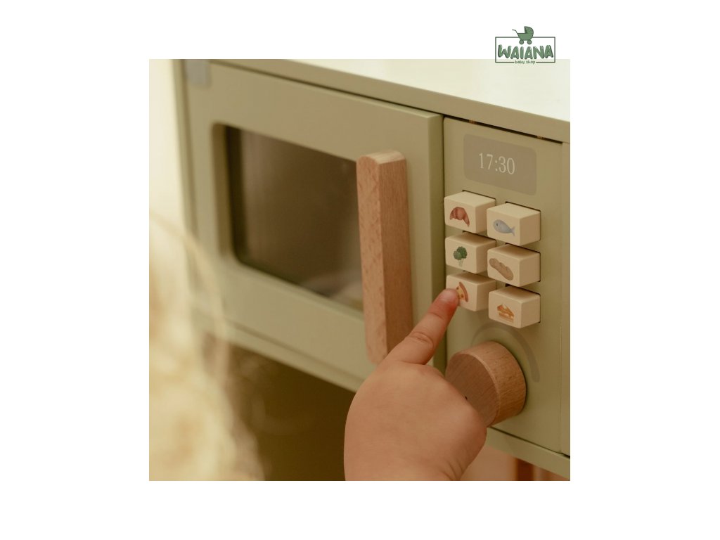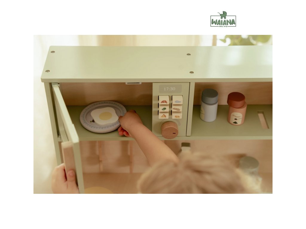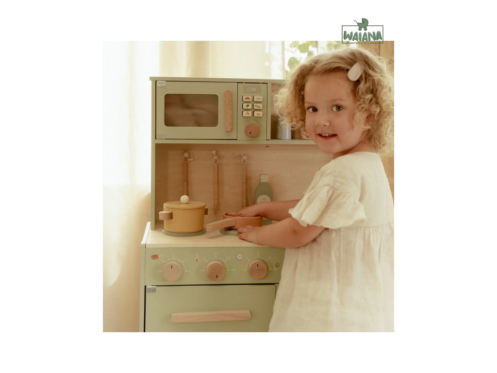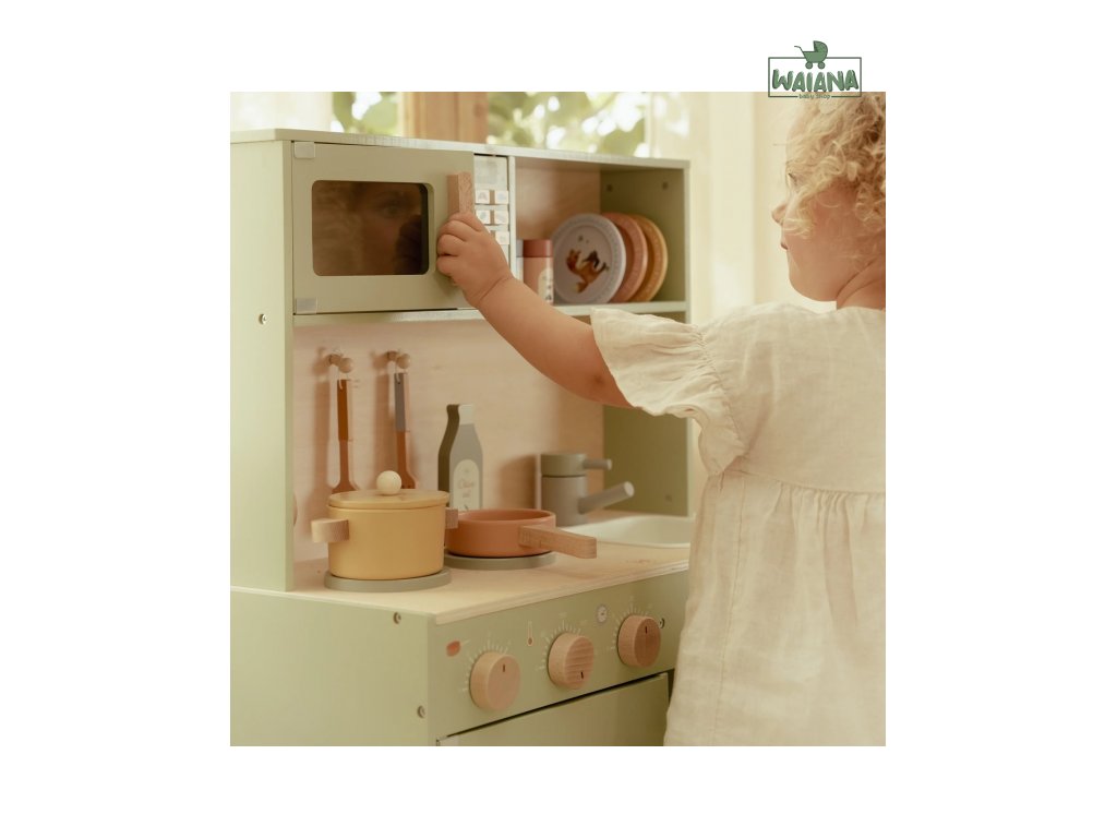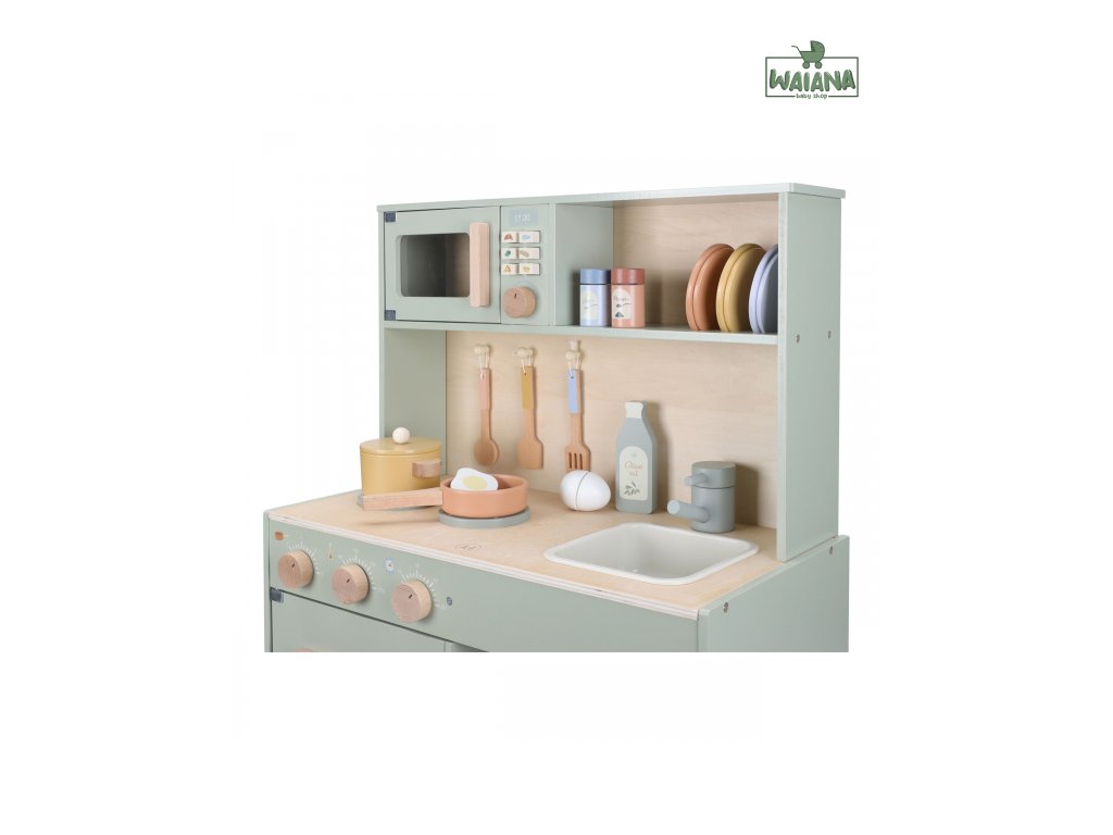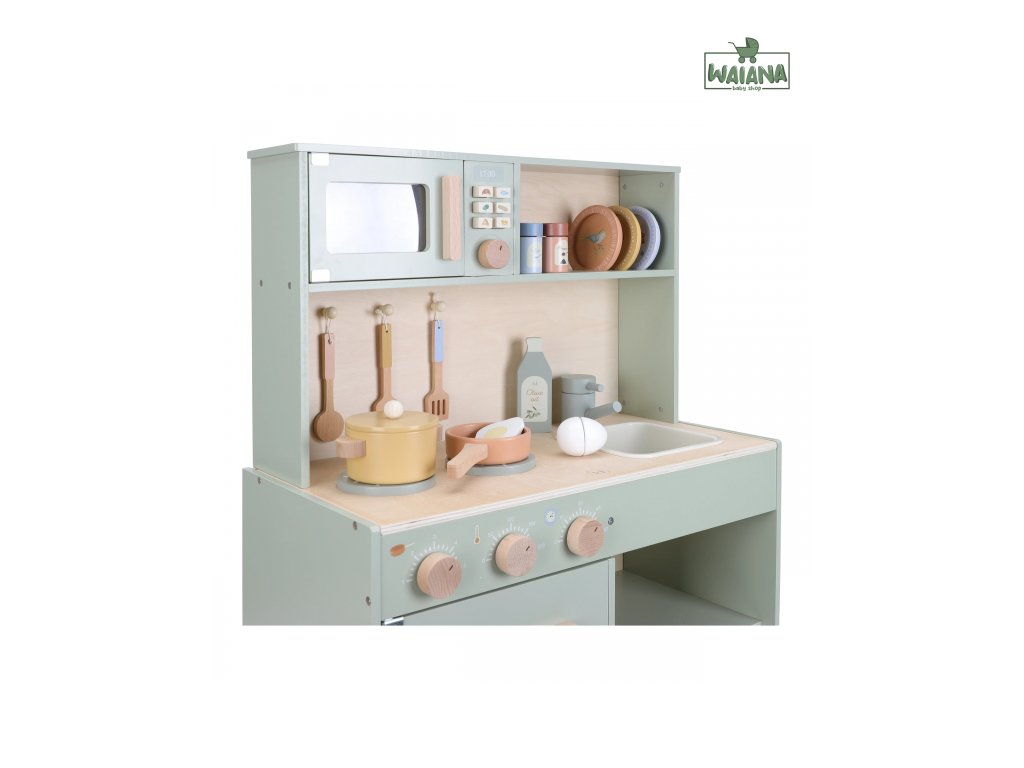 Krásna drevená kuchynka Little Dutch ponúka všetko, o čom malý kuchár či kuchárka sníva, keď vymýšľa nové recepty pre rodinu či svoje bábiky a obľúbené plyšáky. S panvicou, hrncom, tromi tanierikmi a sadou kuchynského náčinia nie je problém pripraviť niekoľko chodov naraz. Rúra upečie koláč, na sporáku sa uvarí zelenina, mikrovlnka rýchlo ohreje, čo je potrebné. K dispozícii je aj olivový olej, vajíčko, soľ a korenie na dochutenie. Po práci si kuchár umyje ruky v dreze. Skrinka ponúka priestor na uloženie potravín.