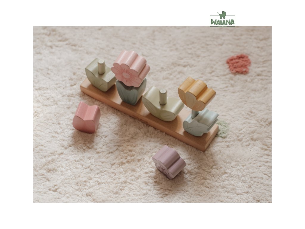 Krásne drevené kvety sú tvorené dvoma dielmi - listami a kvetom, ktoré sa postupne navliekajú na stonku na základni. Listy a kvety sú ľubovoľne kombinovateľné a je tak možné tvoriť zakaždým iné varianty kvetov.