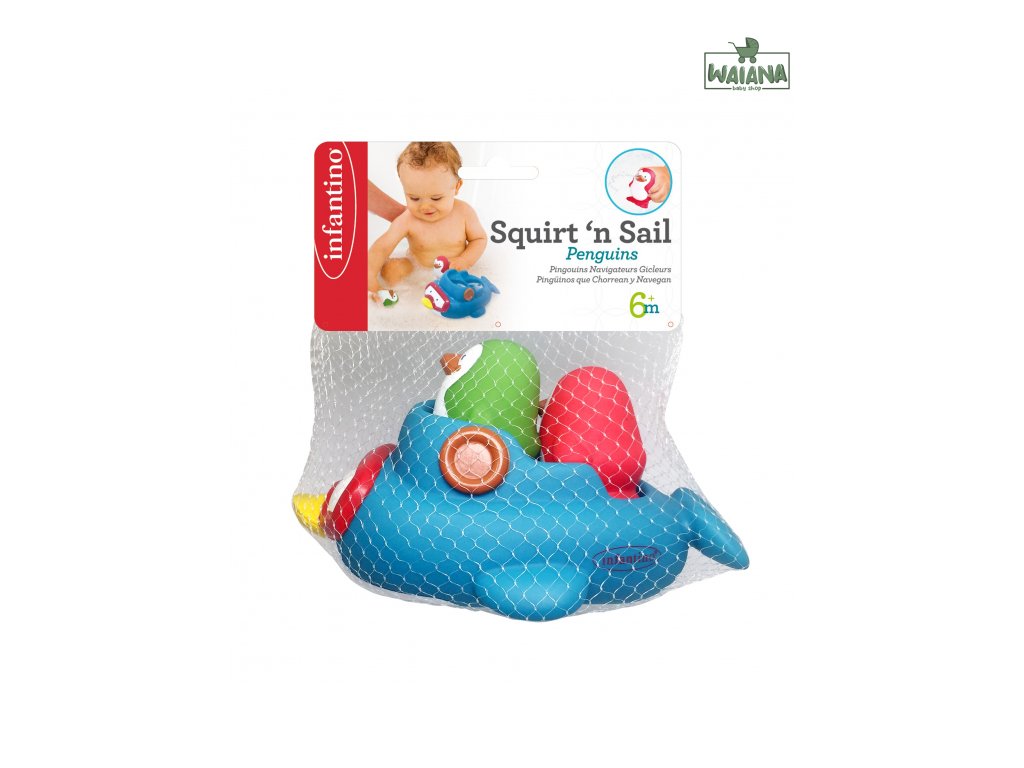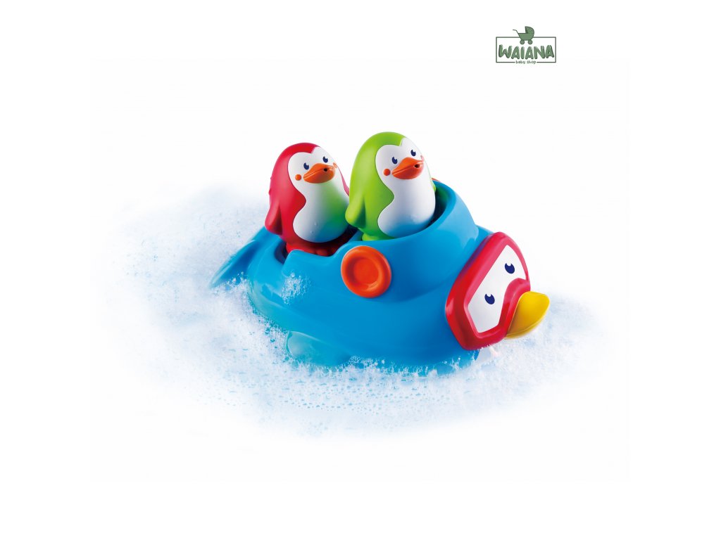 Loďka v podobe maxi tučniaka, ktorý vozí dva malé striekacie tučniaky, je originálna a zábavná hračka do kúpeľa. Vymýšľajte spolu s dieťaťom počas kúpania príbehy o tom, čo všetko tučniaky na svojich výletoch prežívajú a užívajte si spoločne príjemné chvíle pred spaním.