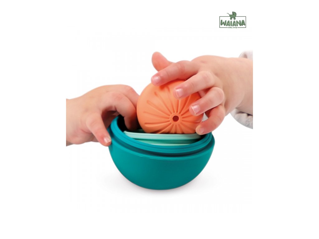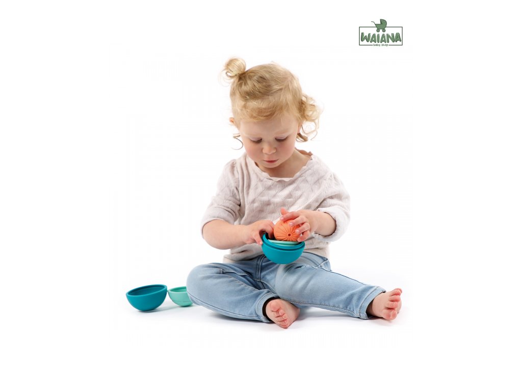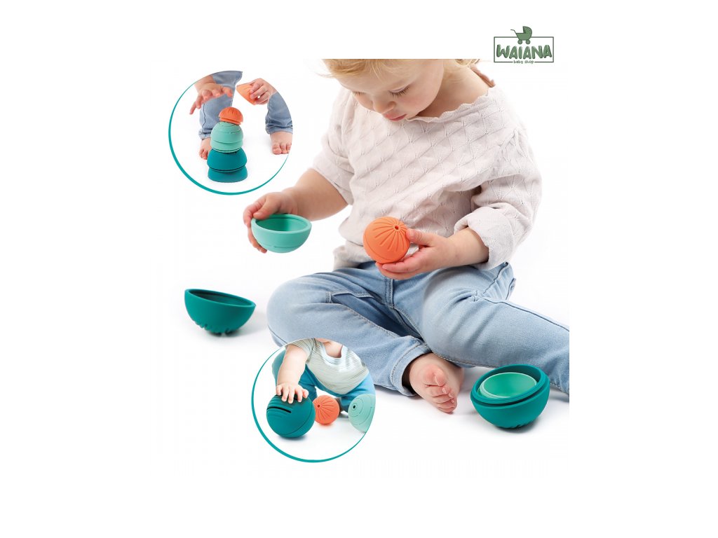 - Jakmile se dítě naučí sedět, může míčky stavět na sebe a vkládat je do sebe jako ruské panenky