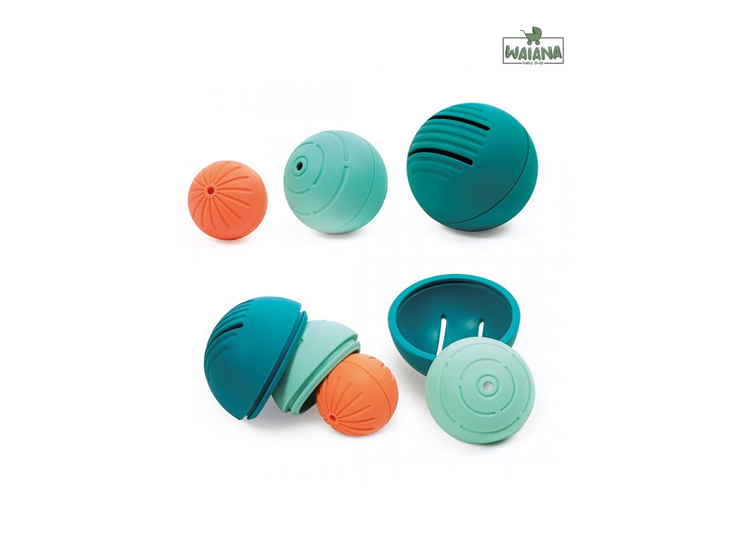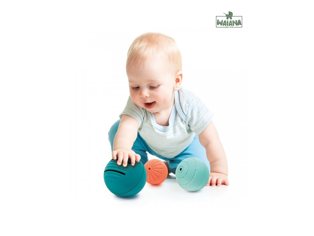 Sada tří měkkých silikonových míčků je ideálním pomocníkem pro rozvoj motoriky a smyslů už od útlého věku. Díky různým velikostem a texturám roste s dítětem a přináší pokaždé nové možnosti hry.