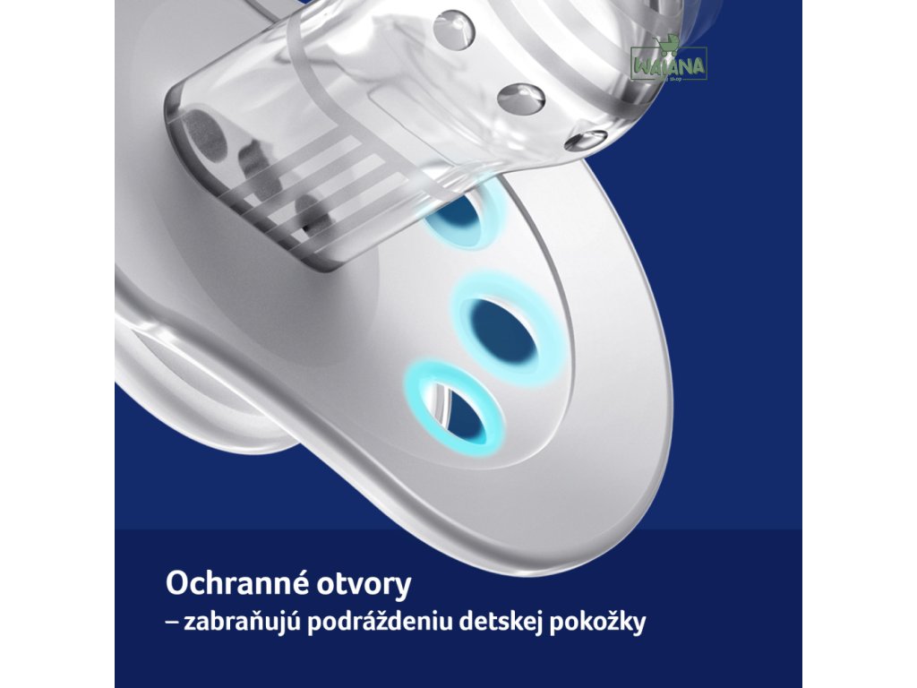 Umožňuje dieťaťu voľne dýchať nosom. Je vyrobený z bezpečného materiálu, ktorý neobsahuje BPA. Jedinečný okraj štítku je vyrobený zo zdravotníckeho materiálu, je príjemný na dotyk a zabraňuje otlačeniu cumlíka.