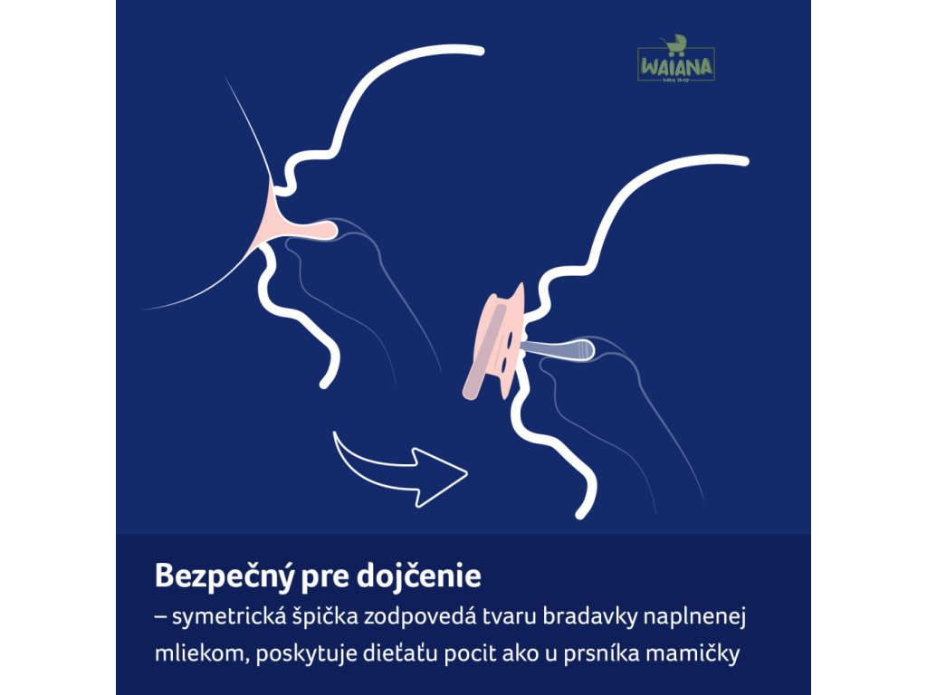 Symetrický tvar špičky podobný bradavke naplnenej mliekom, bábätku poskytuje podobný pocit ako pri prsníku mamičky.