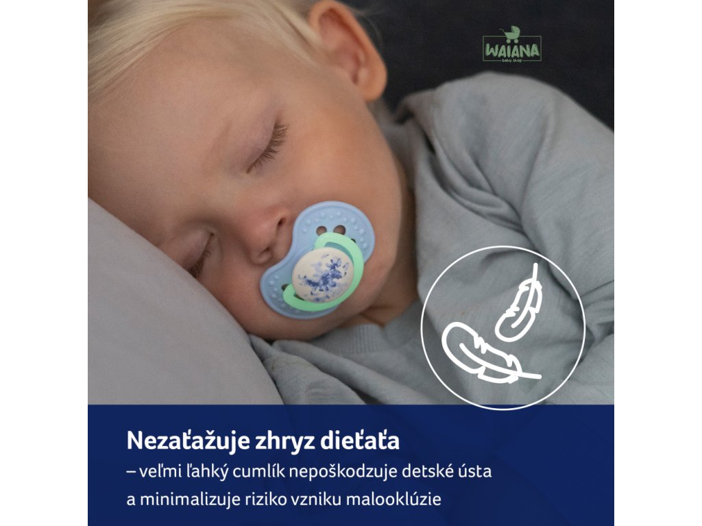 Veľmi ľahký cumlík, ktorý nezaťažuje detské ústa a minimalizuje tak riziko vzniku krivých zubov (malooklúzia).