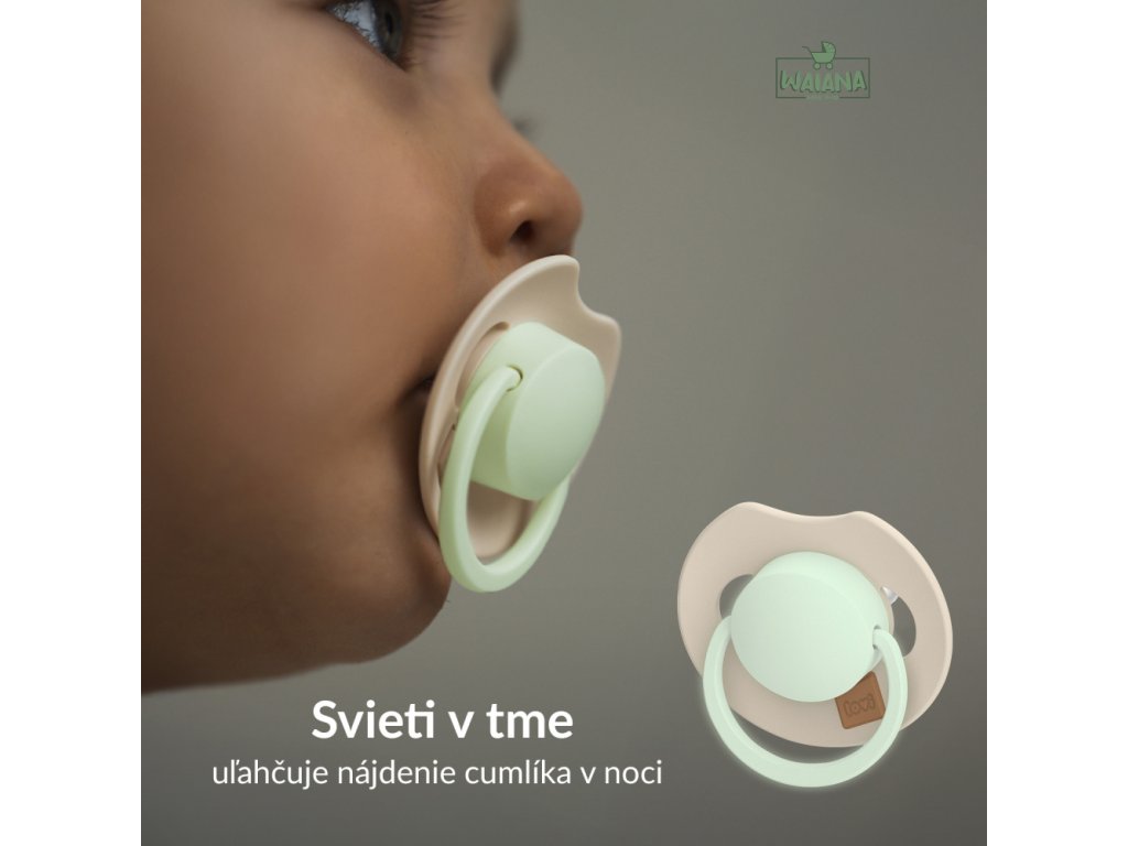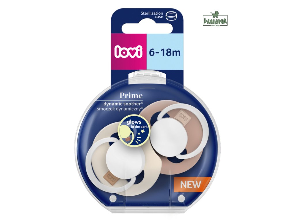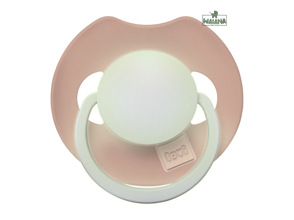 Dynamický cumlík LOVI z kolekcie PRIME má stred a úchytku svietiacu v tme, čo uľahčuje jeho hľadanie v noci.