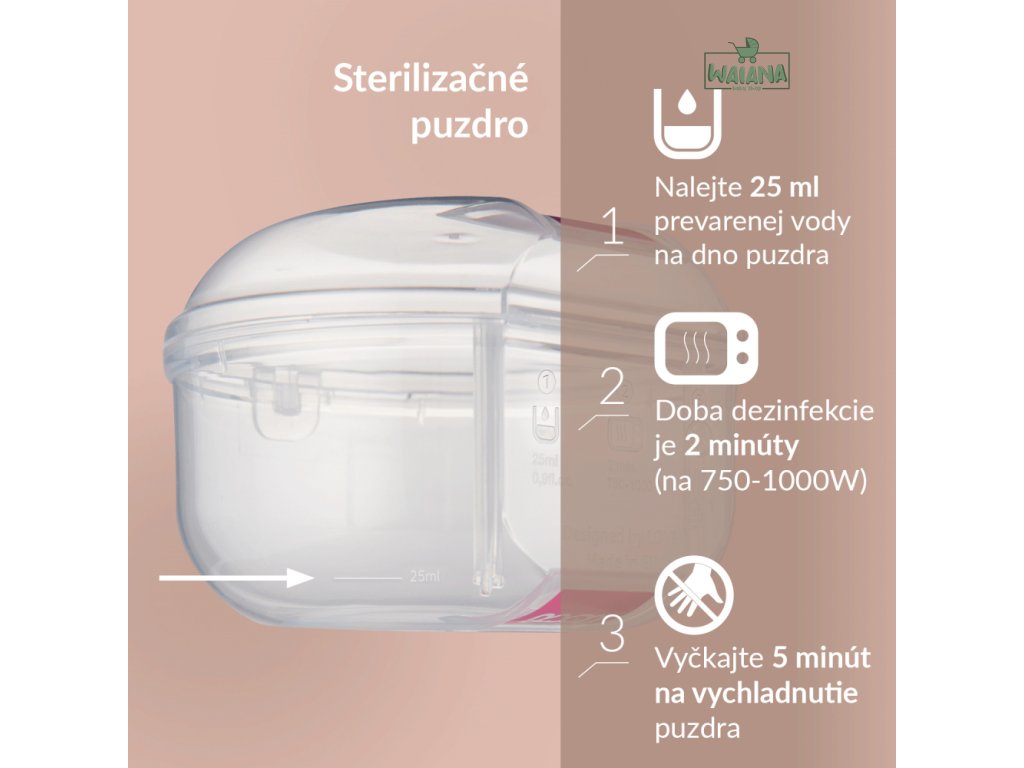 UPOZORNENIE! Nedodržanie tohto pokynu môže viesť k popáleniu alebo poškodeniu výrobku a/alebo mikrovlnnej rúry. • Pred použitím vždy skontrolujte hladinu vody v dezinfekčnom puzdre. • V puzdre je možné dezinfikovať dva cumlíky naraz. • Tento výrobok nie je hračka. Používajte a skladujte výrobok mimo dosahu detí. POUŽITIE 1. Pred prvým a každým ďalším použitím umyte puzdro v teplej vode s jemným saponátom, dôkladne opláchnite. 2. Na dno nalejte 25 ml prevarenej vody. DÔLEŽITÉ Pridanie príliš malého množstva vody môže puzdro poškodiť. Pridanie príliš veľkého množstva vody môže spôsobiť nevhodnú dezinfekciu. 3. Vložte cumlíky do puzdra. 4. Nasaďte veko a pevne zatvorte. 5. Uzavreté puzdro vložte do mikrovlnnej rúry. 6. Pre mikrovlnné rúry 750-1000 W je doba dezinfekcie 2 minúty. Neprekračujte dobu dezinfekcie. UPOZORNENIE! • Puzdro musí byť počas dezinfekcie umiestnené na rovnom povrchu. • Pred vybratím z mikrovlnnej rúry vždy počkajte aspoň 5 minút, kým puzdro vychladne. Pri vyberaní a otváraní buďte opatrní. • Vylejte zostávajúcu vodu z puzdra cez určený otvor, opláchnite a osušte. • Buďte obzvlášť opatrní pri vyberaní dezinfikovaných cumlíkov, pretože môžu byť horúce. • Počas dezinfekcie sa môže do cumlíka dostať voda. Pred použitím cumlíka odstráňte vodu. • Pred ďalšou dezinfekciou počkajte 15 minút, aby puzdro úplne vychladlo. • Dezinfekčné puzdro používajte iba na v ňom zakúpené cumlíky.