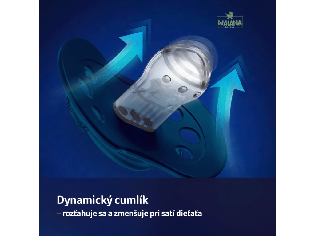 Dynamická špička je vyrobená z nerovnorodých vrstiev silikónu, takže sa predlžuje a zmršťuje v závislosti od rytmu satia dieťaťa. Symetrický tvar pripomína matkinu bradavku. Tvar špičky taktiež umožňuje vloženie cumlíka do úst dieťaťa ľubovoľným spôsobom (nemá určenú vrchnú a spodnú stranu).
