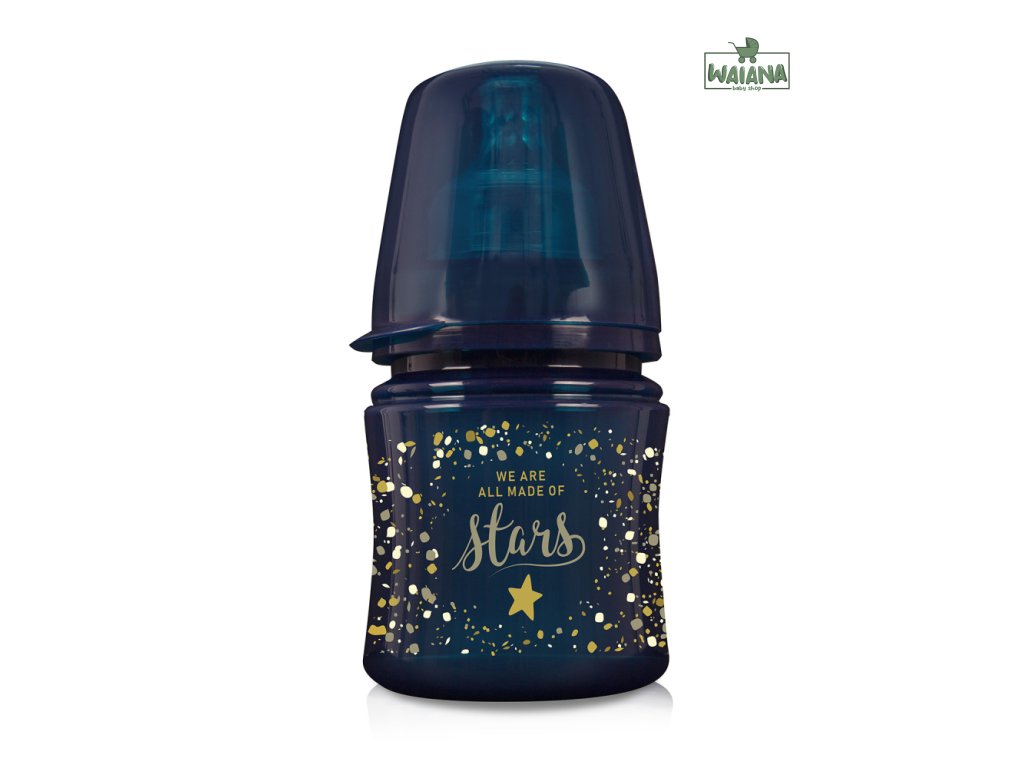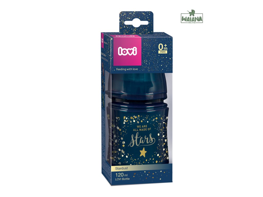 Stardust je tu! Jedinečná, designovo neprehliadnuteľná, prémiová kolekcia od LOVI. Kolekcia sa pýši ľahkou fliaš s objemom 120 ml s dynamickým silikónovým cumlíkom LOVI, ktorý povzbudzuje bábätko k aktívnej činnosti počas sania, rovnako ako pri dojčení a nenarúša tak jeho sací reflex. Fľaša neobsahuje BPA. Unikátny dizajn kolekcie Stardust - zdobenie v podobe zlatého lesku, ktorý pripomína hviezdne nebo.