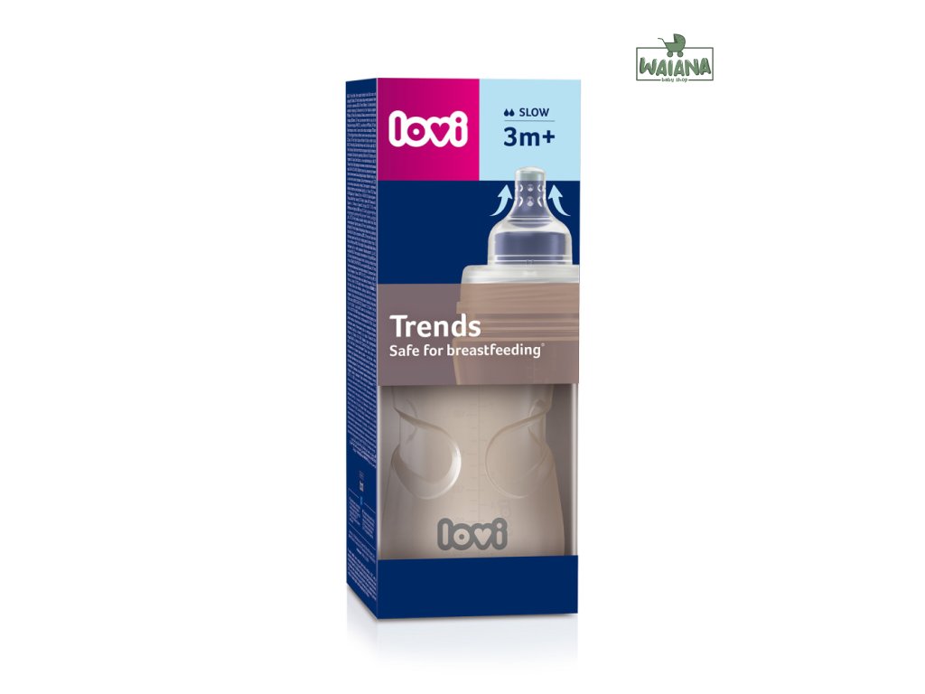 LOVI Fľaša Trends na kŕmenie detí odsatým mliekom od matky. Bezpečné pre dojčené dieťa, nenarúša sací reflex a nenarúša prirodzené kŕmenie. Je vybavená unikátnym cumlíkom na kŕmenie® s tenkým, vyčnievajúcim zakončením, tvrdou, profilovanou základňou a systémeom odvodu vzduchu SUPERvent. Fĺaša je kompatibilná so všetkými odsávačkami LOVI. LOVI Fľaše Trends je potlačená jemným dizajnom v súlade s najnovšími trendmi.