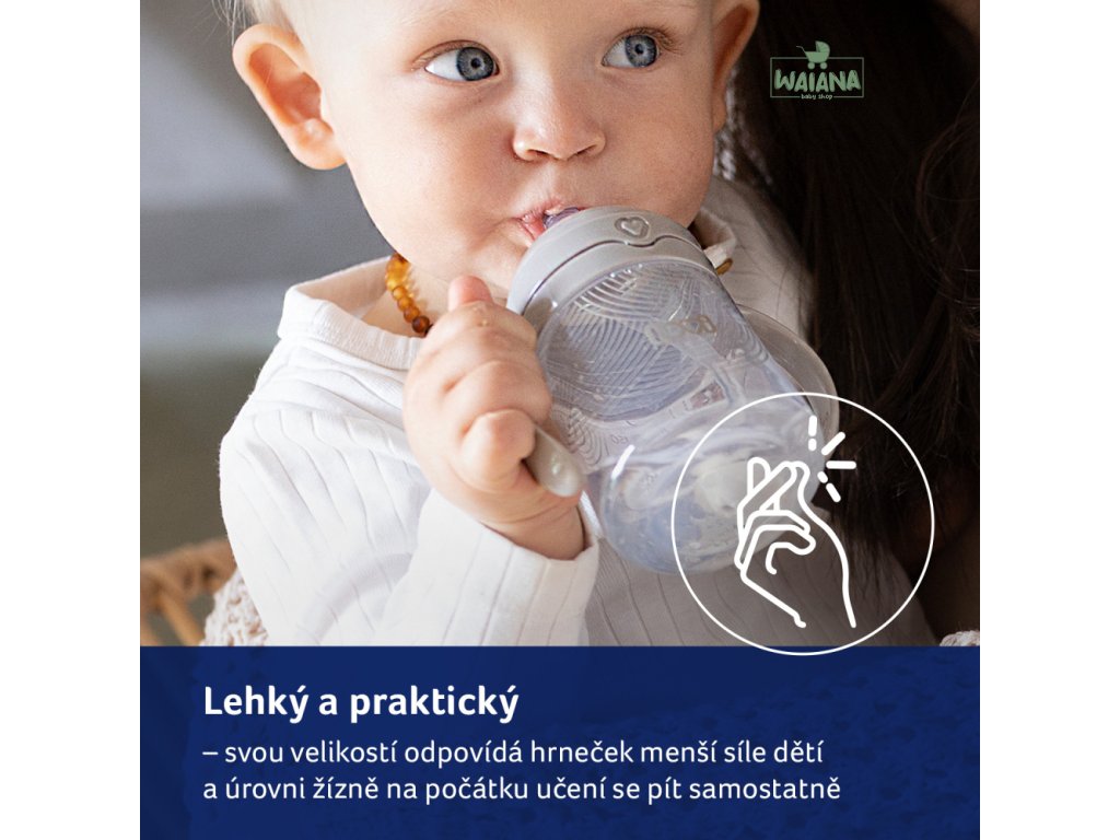 Ľahký a praktický - konštrukcia hrnčeka zodpovedá malej sile a schopnosti prijať množstvo tekutiny dieťaťom na začiatku učenia sa ako piť samostatne