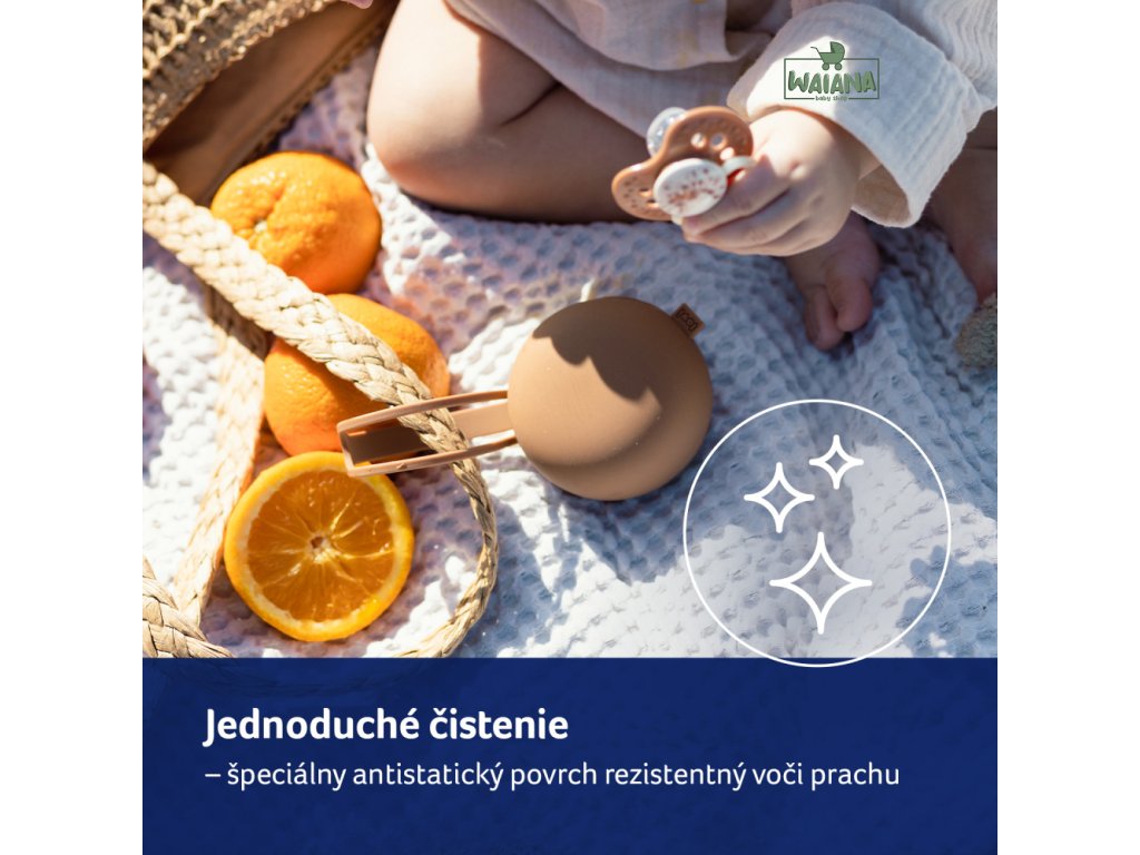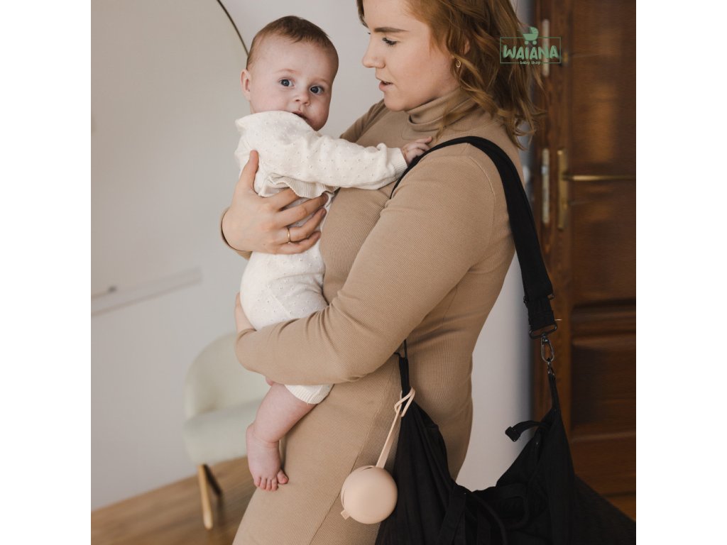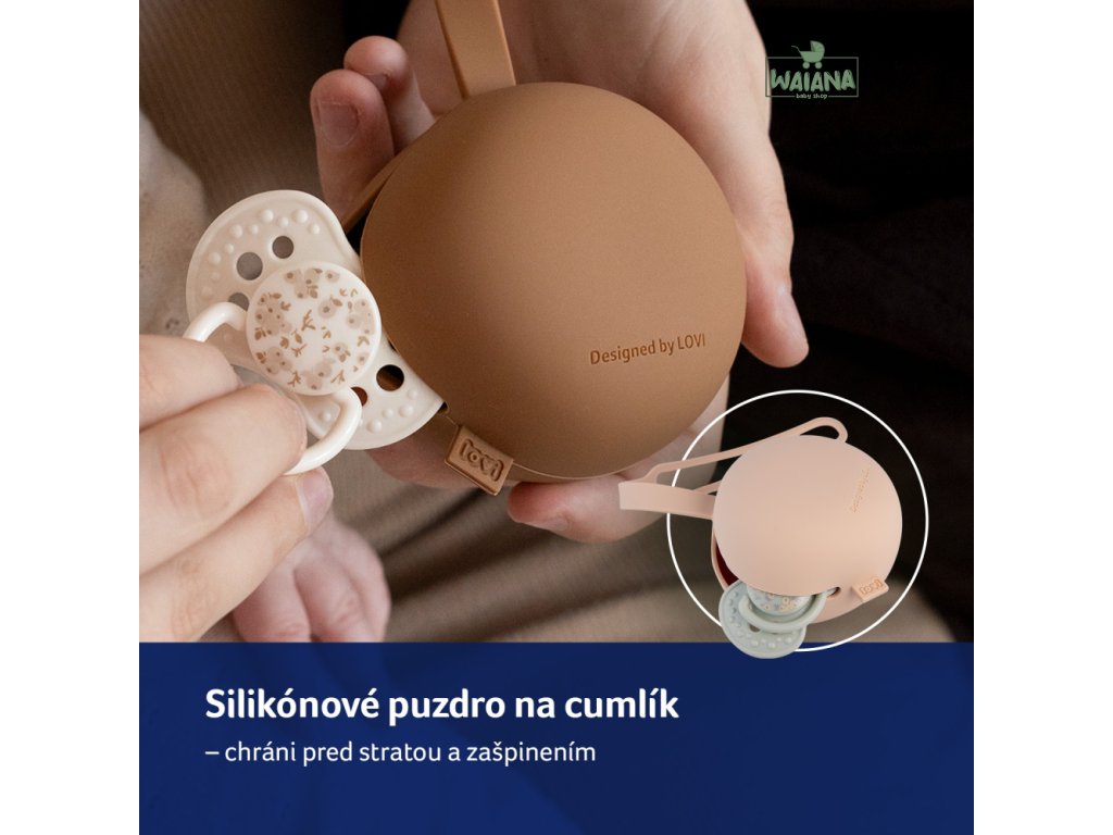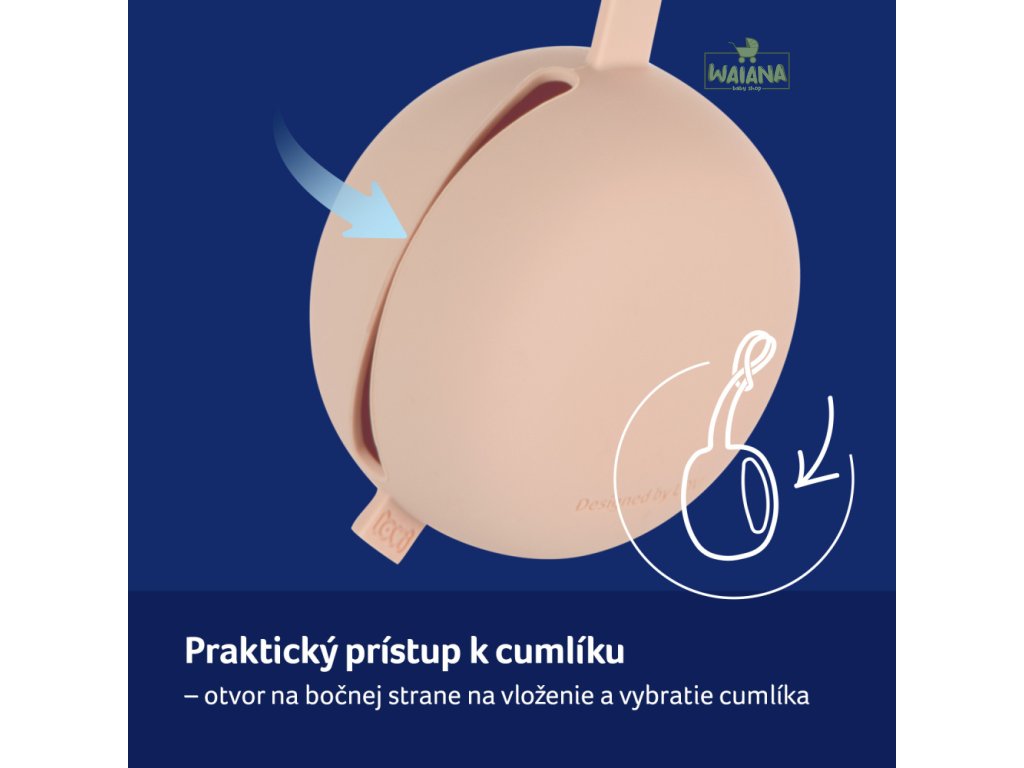 Flexibilnú rukoväť puzdra ľahko pripevníte na tašku alebo kočík a špeciálne navrhnutý postranný otvor umožňuje vloženie a vybratie cumlíka bez nutnosti oddeľovania celého puzdra.