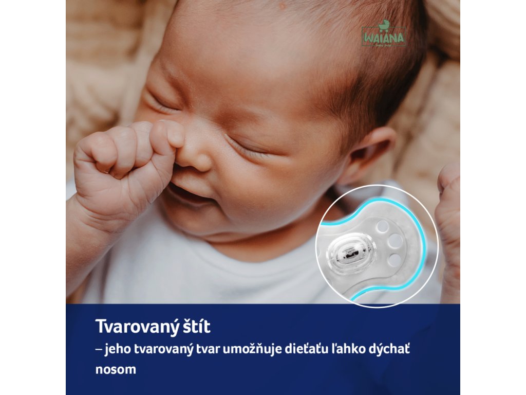 Jeho tvar umožňuje dieťaťu ľahko dýchať nosom; sú použité bezpečné materiálu bez bisfenolu A.