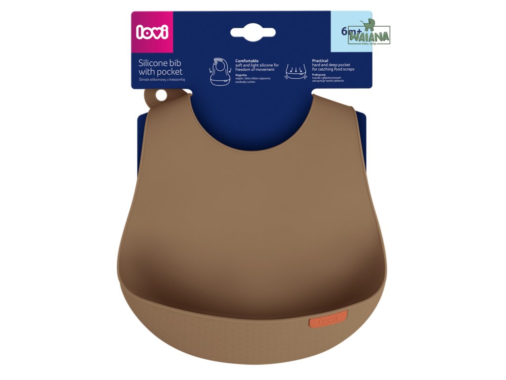 LOVI Silikónový podbradník s vreckom je veľkým pomocníkom pre rodičov - chráni pred nečistotami v čase, keď sa dieťa učí samostatne jesť. Je vyrobený z ľahkého, mäkkého a bezpečného silikónu. Pevné a hlboké vrecko zachytáva zvyšky jedla, pohodlne obopína bruško a zasahuje doširoka do bokov bábätka. Nastaviteľná spona a ergonomický tvar podbradníka, najmä jeho tvarovanej strany, zaisťujú voľnosť pohybu. Podbradník má originálny dizajn vďaka unikátnej štruktúre vrecka a tiež sa ľahko čistí a je vhodný do umývačky.