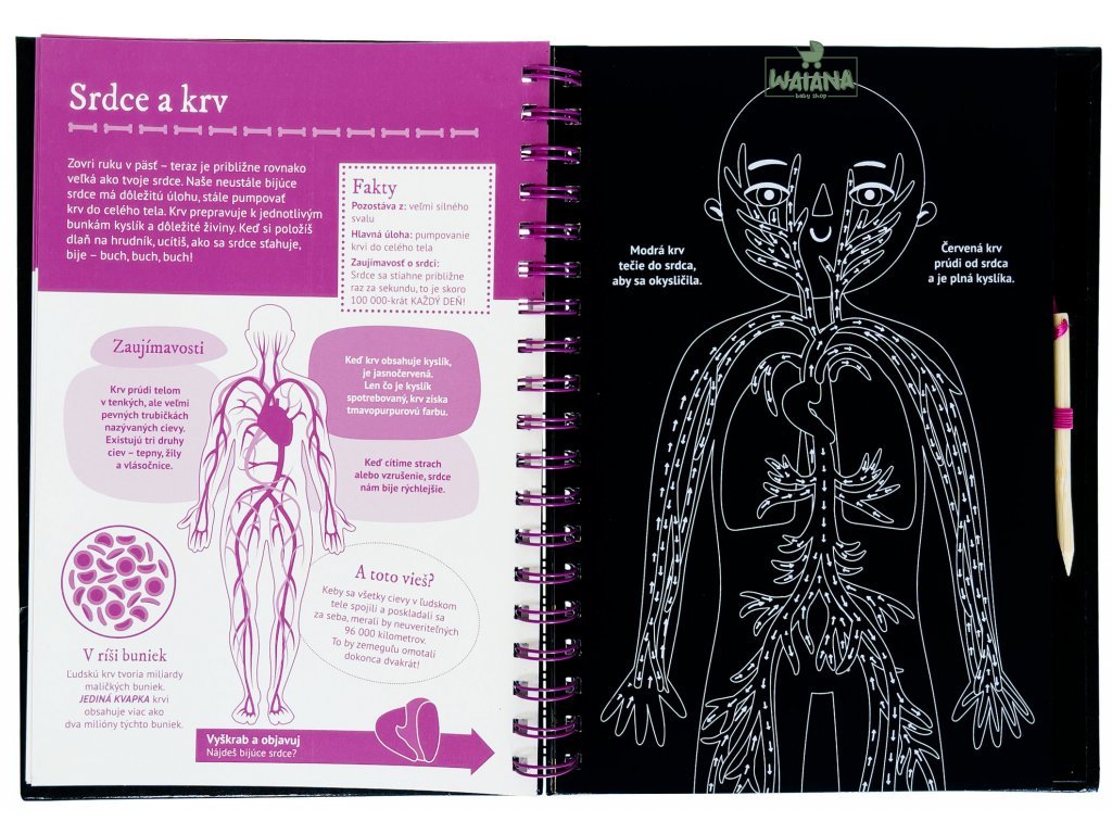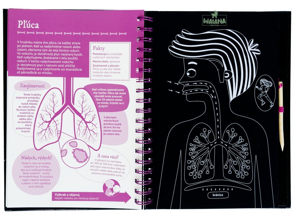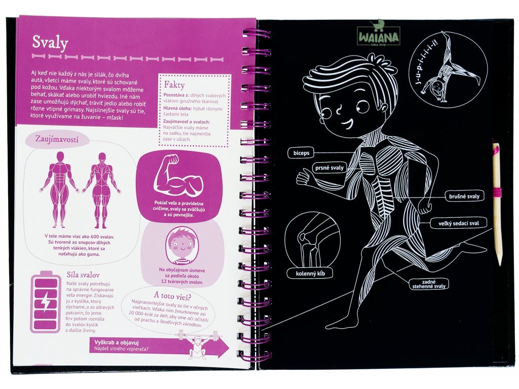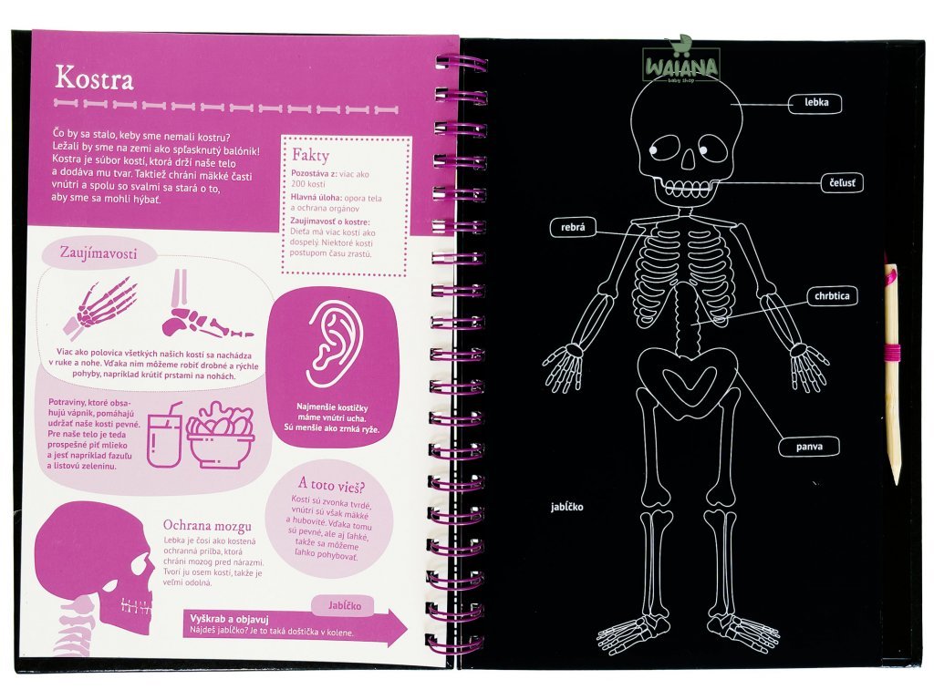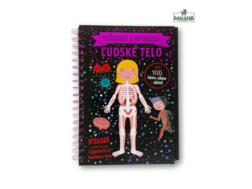 Ľudské telo - Vyškrab a spoznajPriprav sa na prieskum ľudského tela a preškriab si cestu od hlavy až po päty.Vydaj sa na prieskum úžasného ľudského tela a objavuj kostru, svaly i orgány. Táto nápaditá knižka je rozdelená do dvoch častí. V prvej časti je predstavená kostra a jednotlivé orgány, o ktorých sa dozvieš najrôznejšie fakty a zaujímavosti, doplnené stránkami s vyškrabovacími obrázkami s popismi. Druhá časť je potom plná kvízov, doplňovania, bludísk, hľadaní a spájaní. Uži si zábavu s vyškrabovacími obrázkami a objavuj pozoruhodné tajomstvá.Ani tu nechýbajú najrôznejšie fakty a zaujímavosti o ľudskom tele a jeho fungovaní. Tak už na nič nečakaj a vydaj sa za týmto vyškrabovacím dobrodružstvom.