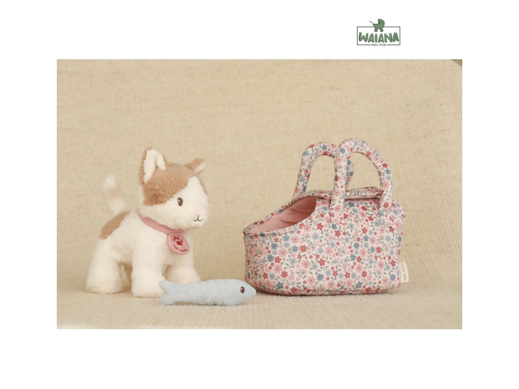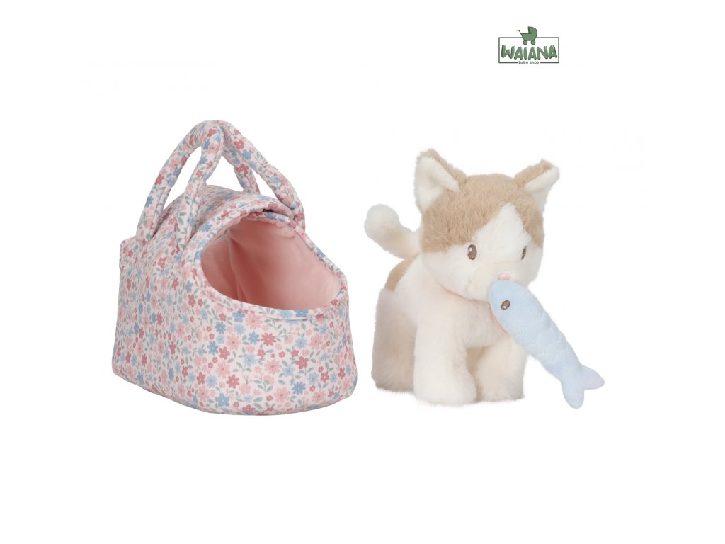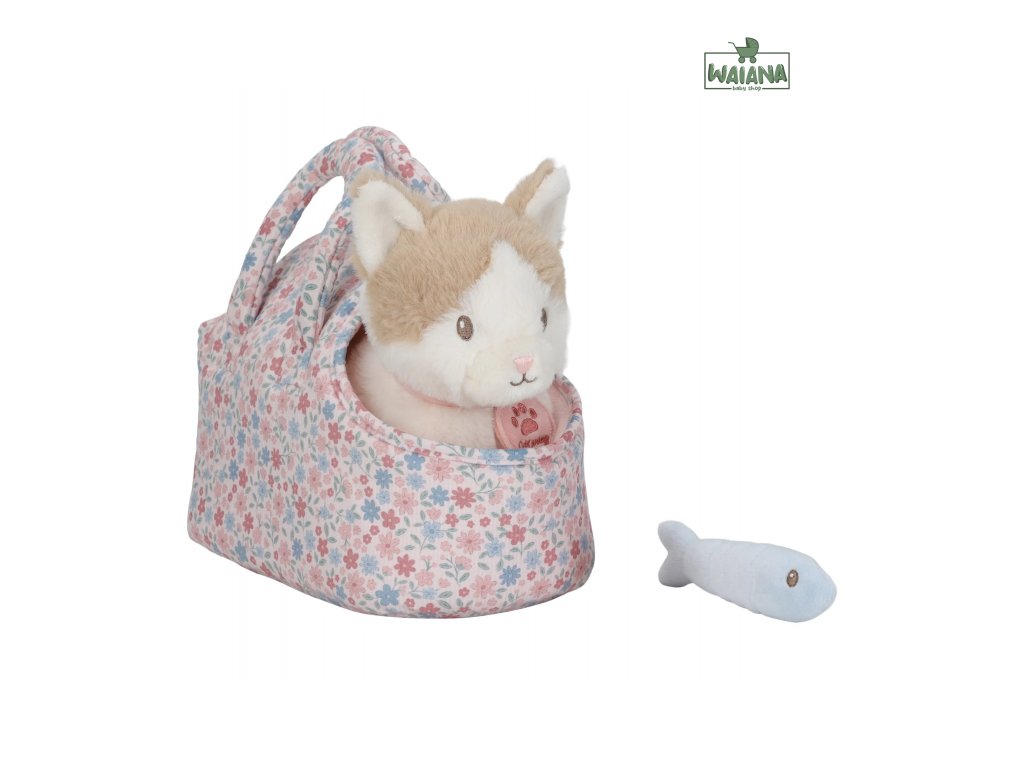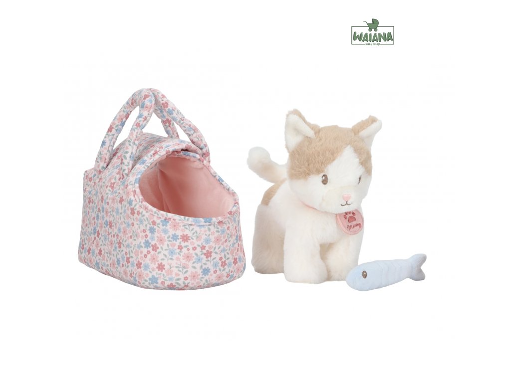 Mačička prichádza v elegantnej kvetovanej taške s predným otvorom, aby mohla zvedavo vykukovať von. Vďaka tomu si ju deti môžu vziať kamkoľvek – na prechádzku, na výlet, do škôlky alebo napríklad k starým rodičom. Na krku má prívesok so svojim menom. Plyšová rybka na hranie má vo vnútri magnet, takže drží mačičke pri papuľke.
