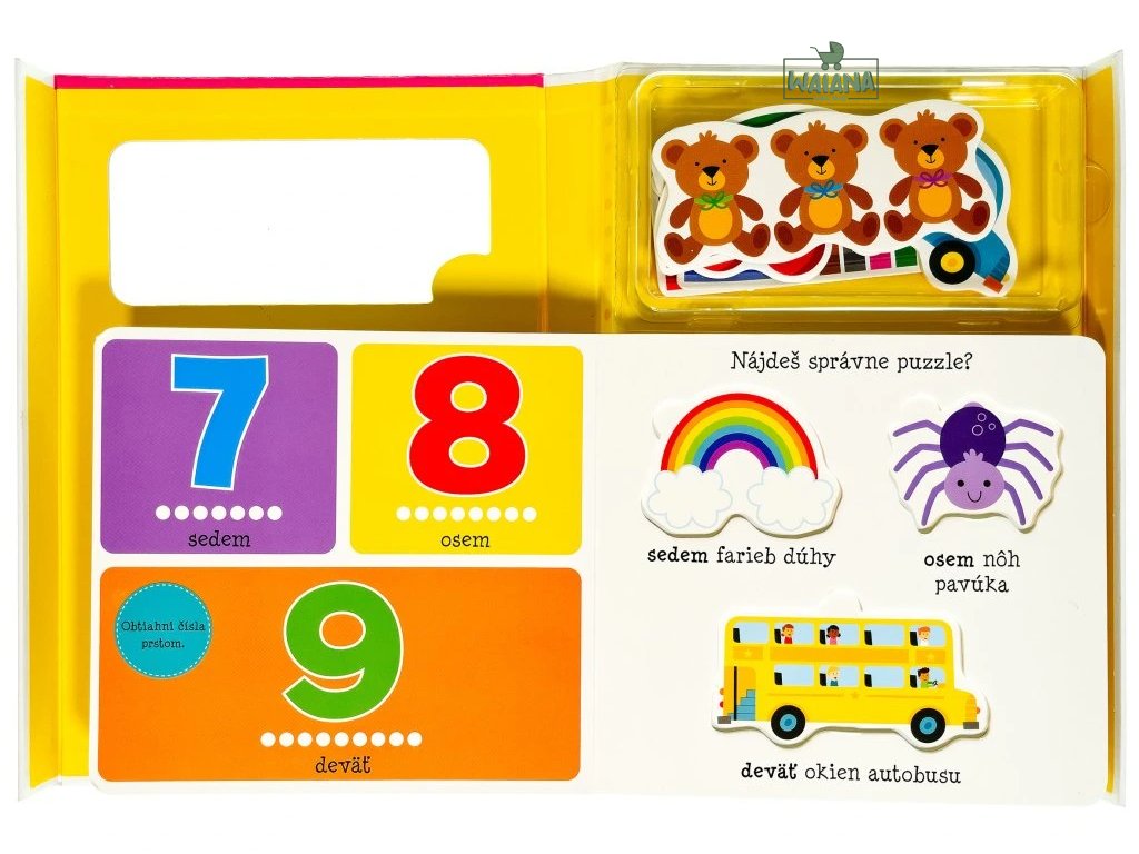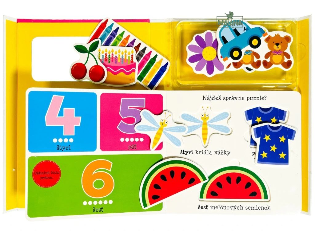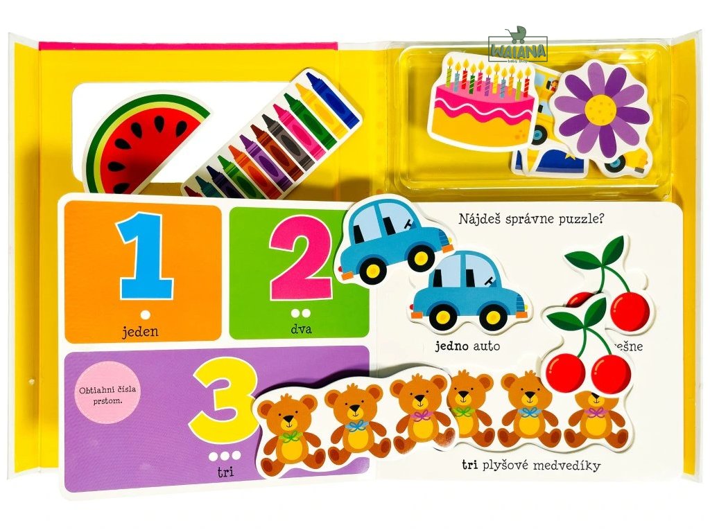 Malé dieťa sa učí ČíslaDokážeš vložiť všetky puzzle na správne miesta a dokážeš všetky predmety aj pomenovať?Praktická kazeta s knižkou z pevného materiálu obsahuje 12 puzzle, na ktorých si najmenšie deti budú trénovať jemnú motoriku a zoznamovať sa s číslami.Puzzle aj knižka deti zoznámi s číslami od 1 až do 12, ako aj s rôznymi predmetmi, na ktorých si môžu počítanie skúšaťOkrem puzzle, vďaka ktorým deti budú rozvíjať a trénovať jemnú motoriku, na malých zvedavcov čakajú aj otázky a úlohy, ktoré im pomôžu si nové znalosti a už nadobudnuté vedomosti precvičiť a lepšie si ich tak osvojiť. S knižkou aj puzzle sa vaše deti rozhodne nudiť nebudú a strávia s nimi celé hodiny pri hrách a učení.