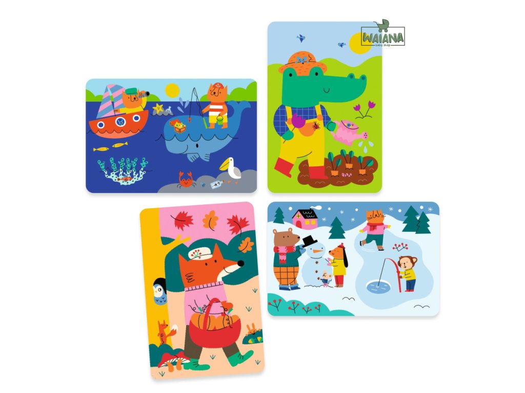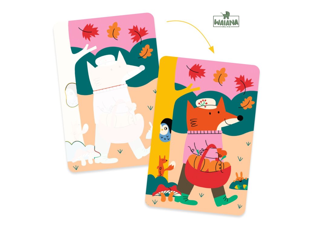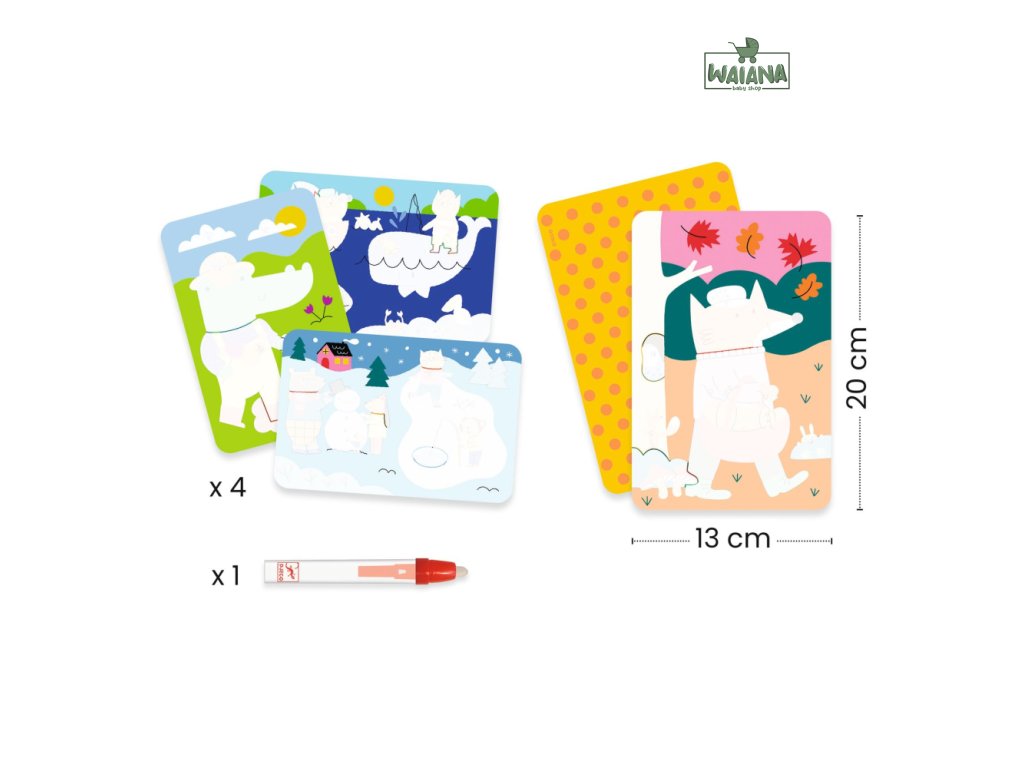 Maľovanie vodou 4 ročné obdobiaKúzlo farieb počas celého rokaSada Maľovanie vodou 4 ročné obdobia je skvelá kreatívna aktivita pre deti od 18 mesiacov. Pomocou špeciálneho štetca-ceruzky naplnenej vodou môžu deti „oživiť“ biele plochy na obrázkoch a objaviť nádherné farby a vzory. Po zaschnutí sa plochy opäť zbielia, takže sa dá obrázok vyfarbovať znova a znova.Prečo je táto sada ideálna pre deti: