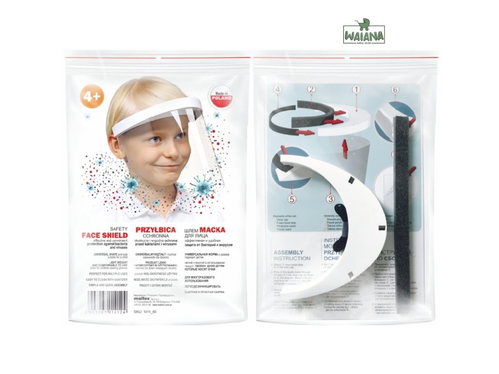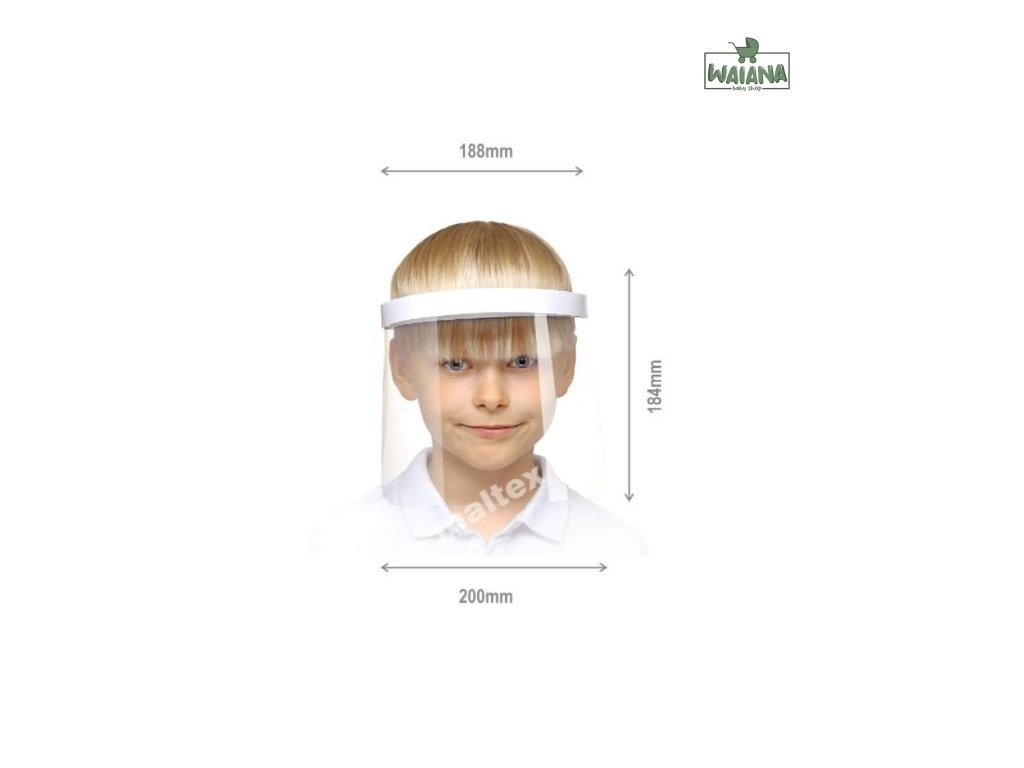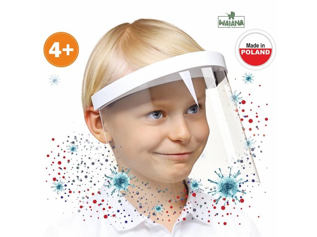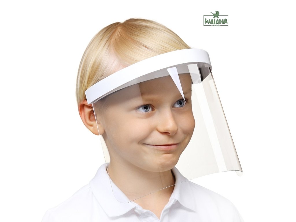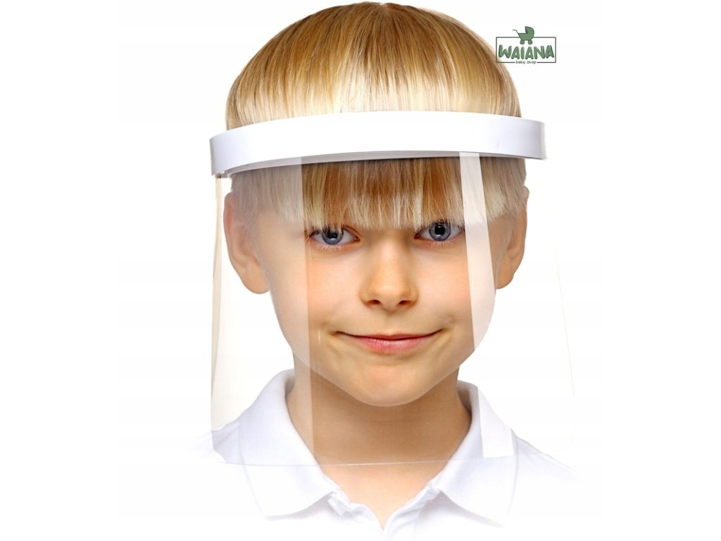 Ochranný štít na tvár pre deti. Účinná a pohodlná ochrana pred baktériami a vírusmi. Univerzálny tvar a veľkosť. Ľahká hmotnosť a pohodlné použitie aj pre deti, ktoré nosia okuliare.