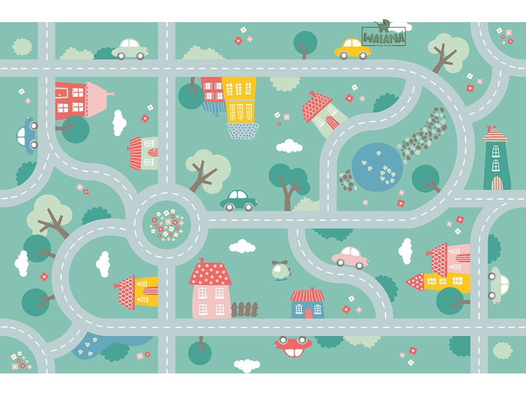 Vinylová podložka "Vidiecka ulička" má farebnú potlač zobrazujúcu rôzne aspekty vidieckeho života. Panoráma predstavuje početné budovy, kľukaté uličky a ďalšie prvky, ktoré umožnia deťom rozvíjať ich predstavivosť a kreativitu a zároveň poskytujú skvelú zábavu.