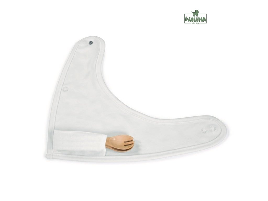 Podbradník: Súčasťou súpravy je podbradník, ktorý slúži aj ako cestovné puzdro. Je vyrobený zo 100% organickej bavlny, je veľmi mäkký a jemný k detskej pokožke. Vďaka vnútornému vrecku a zapínaniu na patent sa do neho dajú hygienicky zabaliť príbory.