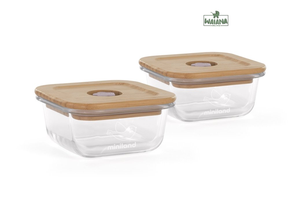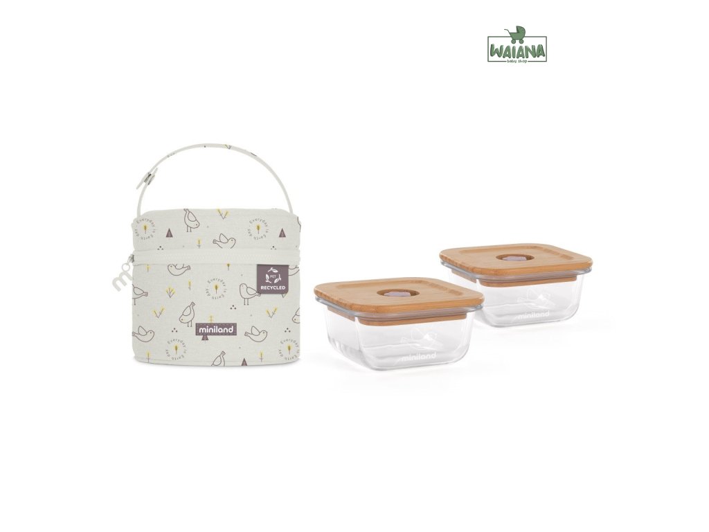 Miniland ECO-friendly Sklenené štvorcové nádoby 2x210 ml s izotermickou taškou, Vtáčik