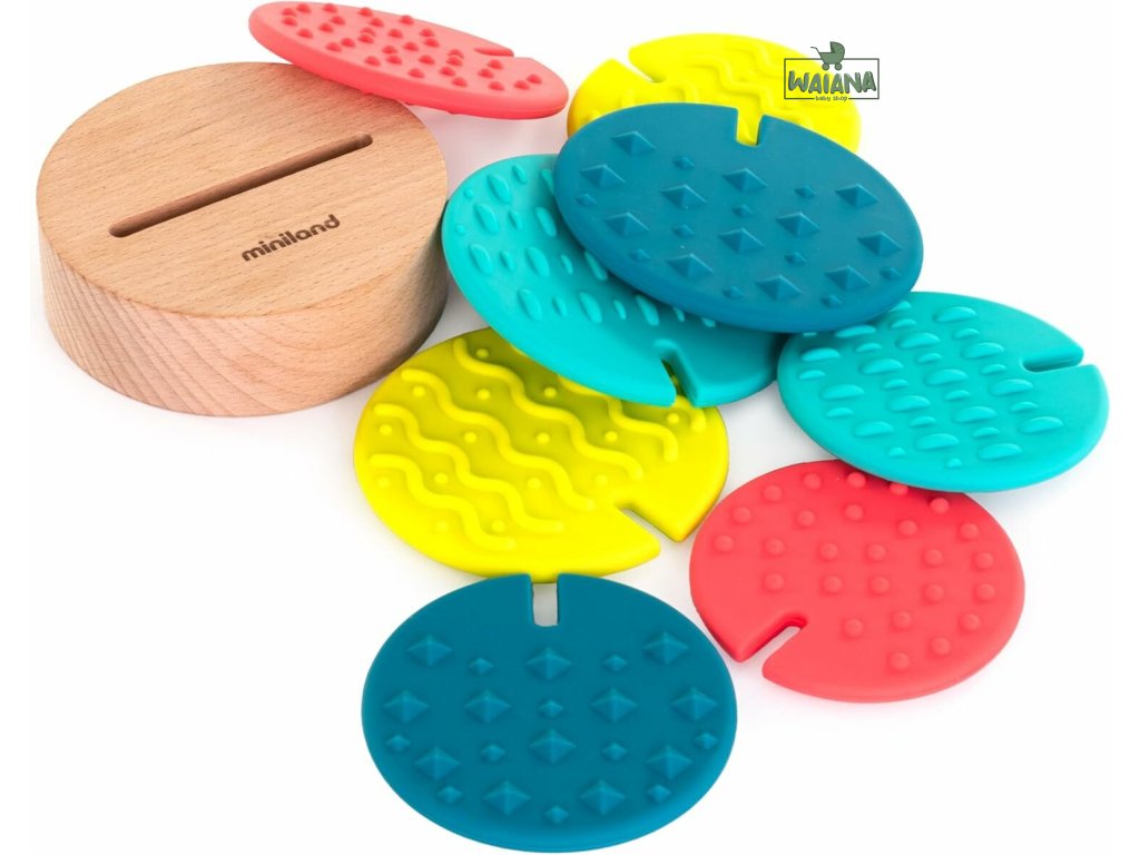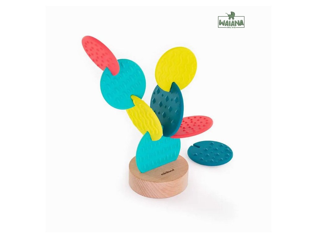 Táto jedinečná hračka sa skladá z drevenej základne a 8 flexibilných silikónových prvkov s rôznymi textúrami a farbami, ktoré sa dajú skladať na seba v rôznych kombináciách.