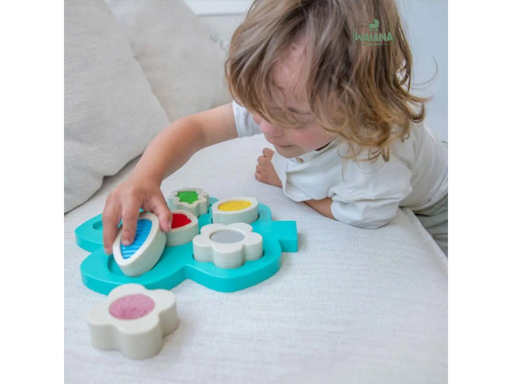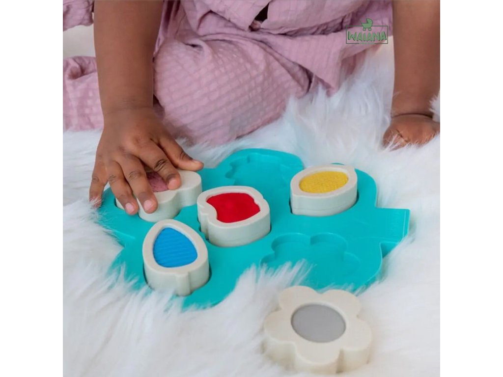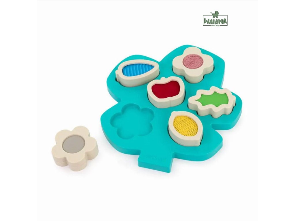 Senzorická skladačka Strom obsahuje 6 dielikov s rôznymi textúrami a kontrastnými farbami v tvare listov, plodov a kvetov. Tieto dieliky slúžia na hmatovú a vizuálnu stimuláciu.