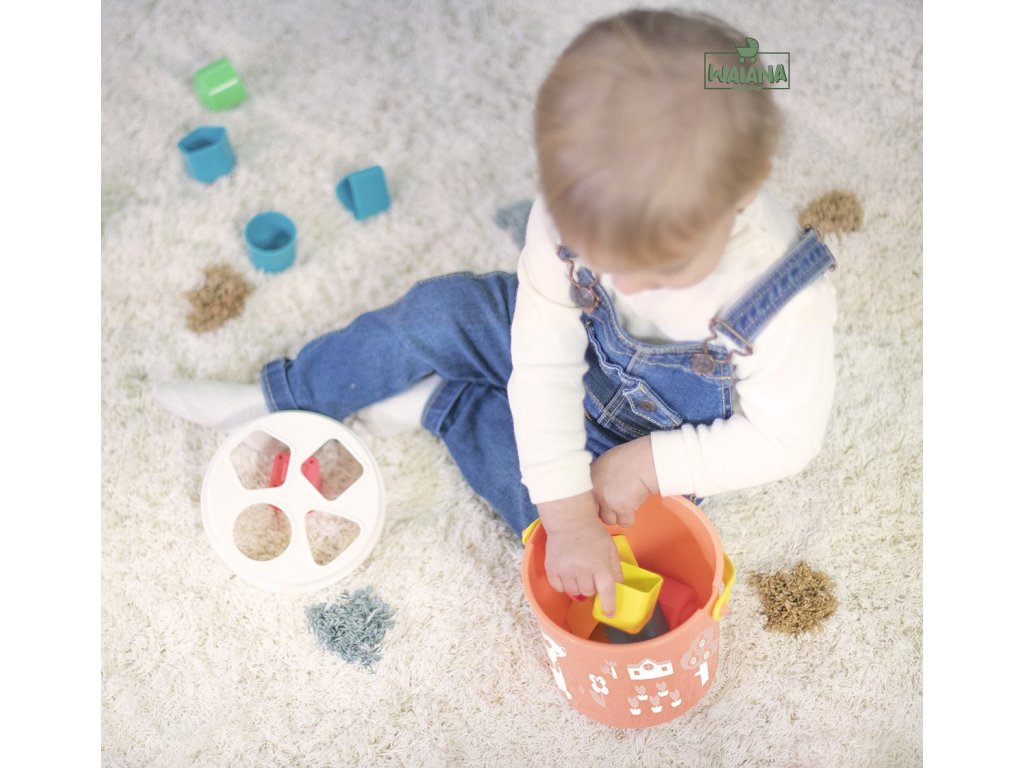 Sada obsahuje 16 farebných prvkov v 4 základných tvaroch: kruh, trojuholník, štvorec a päťuholník. Dieťa sa učí vkladať správne tvary do zodpovedajúcich otvorov na veku vedierka. Tento proces prirodzene rozvíja kľúčové zručnosti: