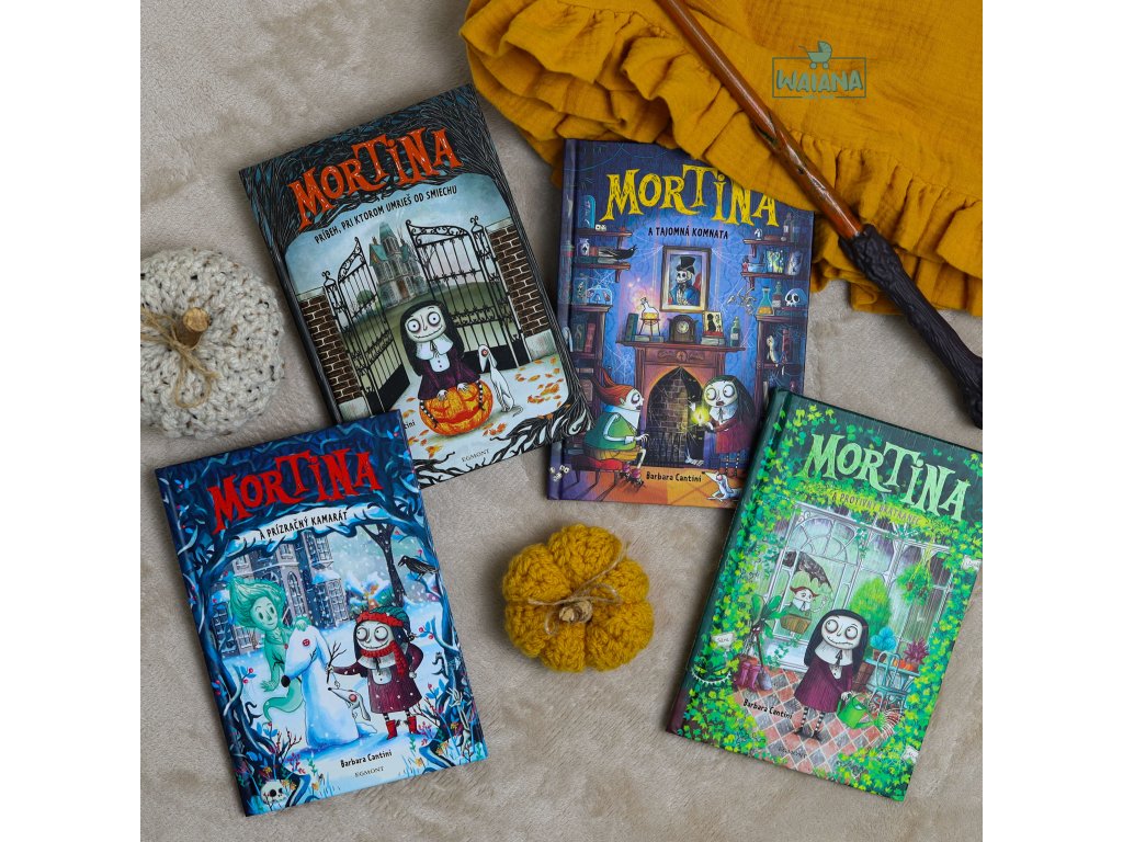 Mortina a tajomná komnata 6Každý dom ukrýva nejaké tajomstvá... To dobre vie aj Mortina, ktorá v knižnici vo vile Rozvalinke objaví tajnú chodbu vedúcu k dverám s prazvláštnym zámkom. Aby Mortina odhalila, čo sa za nimi ukrýva, vydá sa spolu s bratrancom Dilbertom a chrtom Truchlíkom na cestu plnú prekvapení a zvratov. Za dverami totižto nájde odpoveď na jedinú ozajstnú otázku: prečo je jej rodina... rodinou strašidiel?