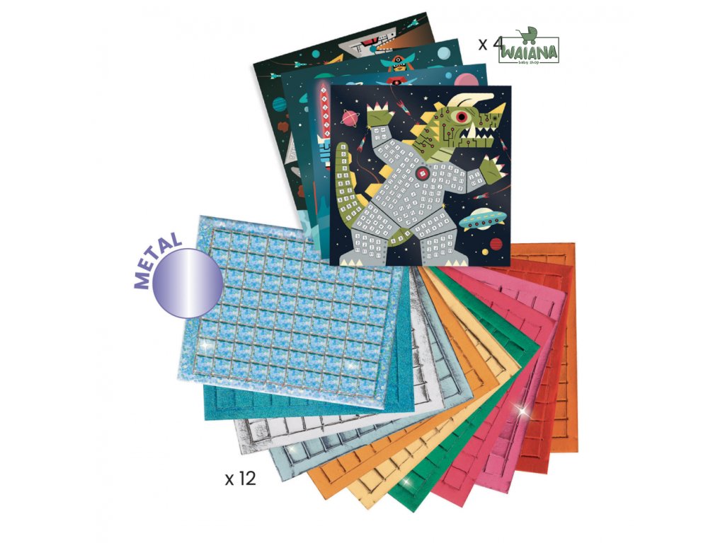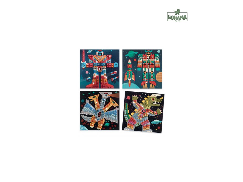 Mozaika s obrázkami vesmírnych bojovníkov rozvíja detskú kreativitu. Roboti a príšery v plnej zbroji! Sada pre malých milovníkov vesmíru obsahuje 4 obrázky vesmírnych bojovníkov na dotvorenie samolepiacimi penovými mozaikovými dielikmi s metalickým leskom. Deti si precvičia jemnú motoriku a koncentráciu. Priložený obrázkový návod obsahuje farebný kód na správne umiestnenie dielikov. K bielym očíslovaným políčkam na obrázkoch sú v návode priradené farby. Mozaika podľa čísel je alternatívou k maľovaniu podľa čísel. Mozaikové dieliky sú samolepiace, a preto je práca s touto sadou čistá a dá sa realizovať v podstate kdekoľvek. Obsah: 4 obrázky na dotvorenie, 12 hárkov samolepiacich penových mozaikových dielikov, obrázkový návod. Rozmery obrázkov: 20 x 20 cm.