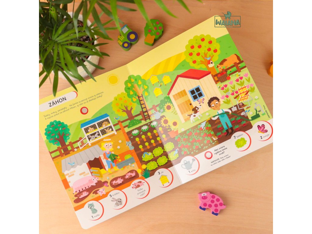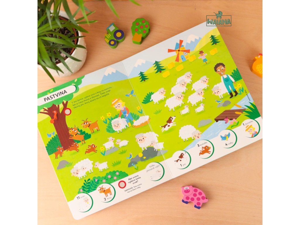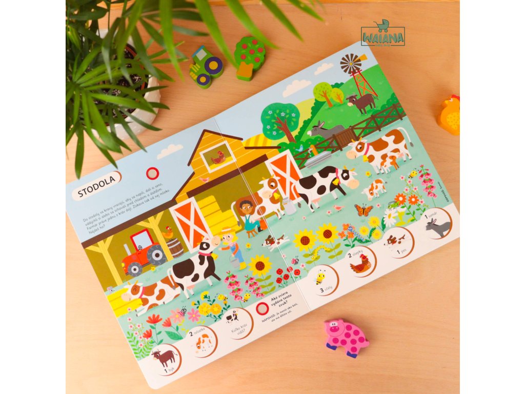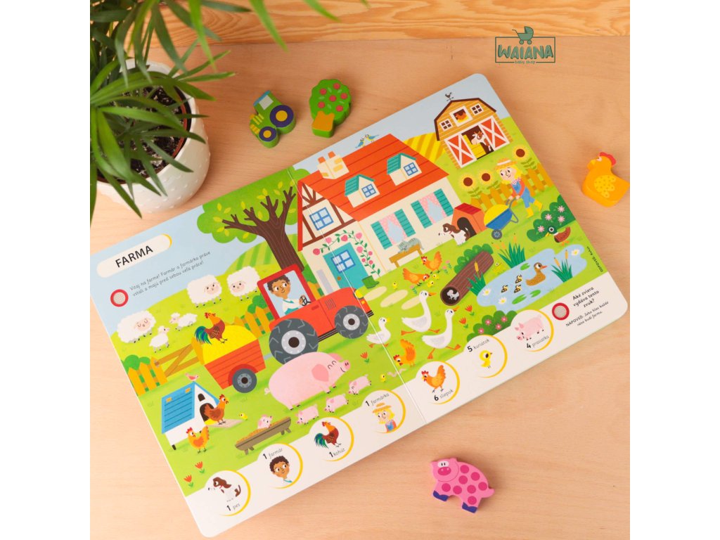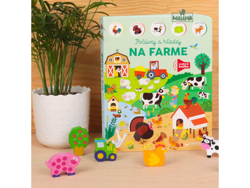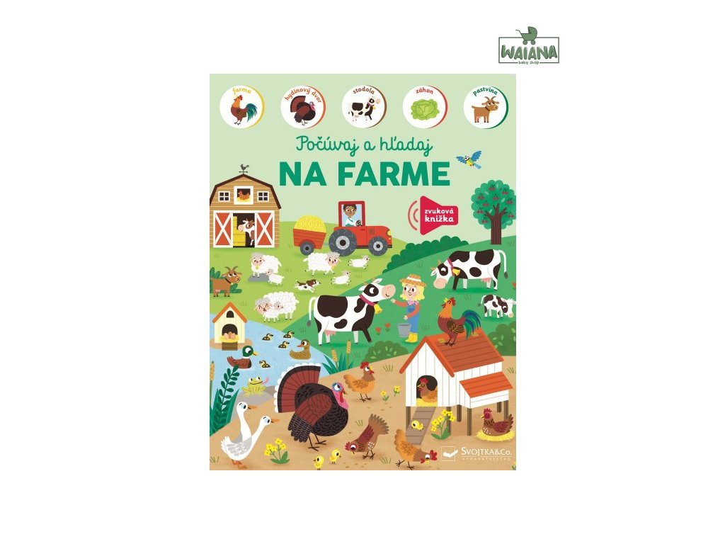 Na farme - Počúvaj a hľadajHľadaj a spoznávaj s touto zvukovou knihou zvieratá z rušnej farmy!Prehliadni si obrázky, počúvaj zvuky a objavuj hospodárske zvieratá z farmy!V rôznych častiach farmy, od stodoly cez pastvinu až po hydinový dvor, sa zoznámiš s jej obyvateľmi a dozvieš sa aj zaujímavé informácie.Na každej strane tejto krásne ilustrovanej knižky počúvaj najrôznejšie zvuky a spoznaj, ktoré zvieratá ich vydávajú. Ale neboj! Dostaneš aj nápovede, ktoré ti zvieratá predstavia, a aj tu sa dozvieš ďalšie zaujímavosti z farmy a zo zvieracej ríše.