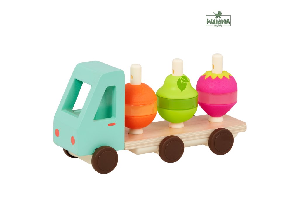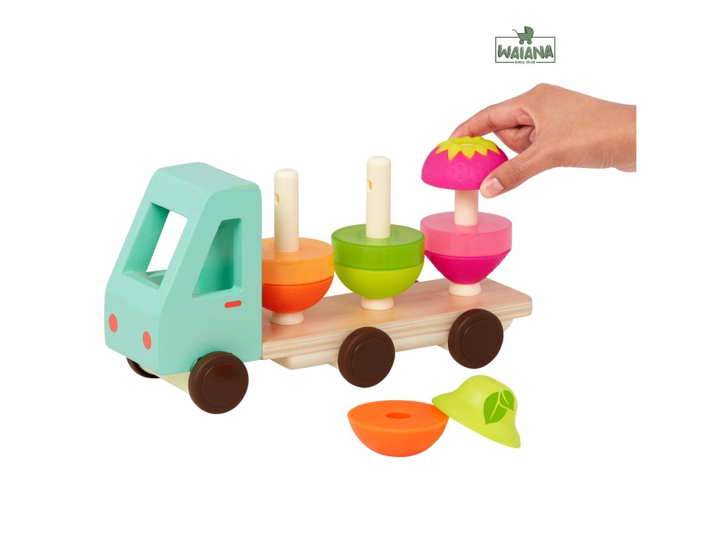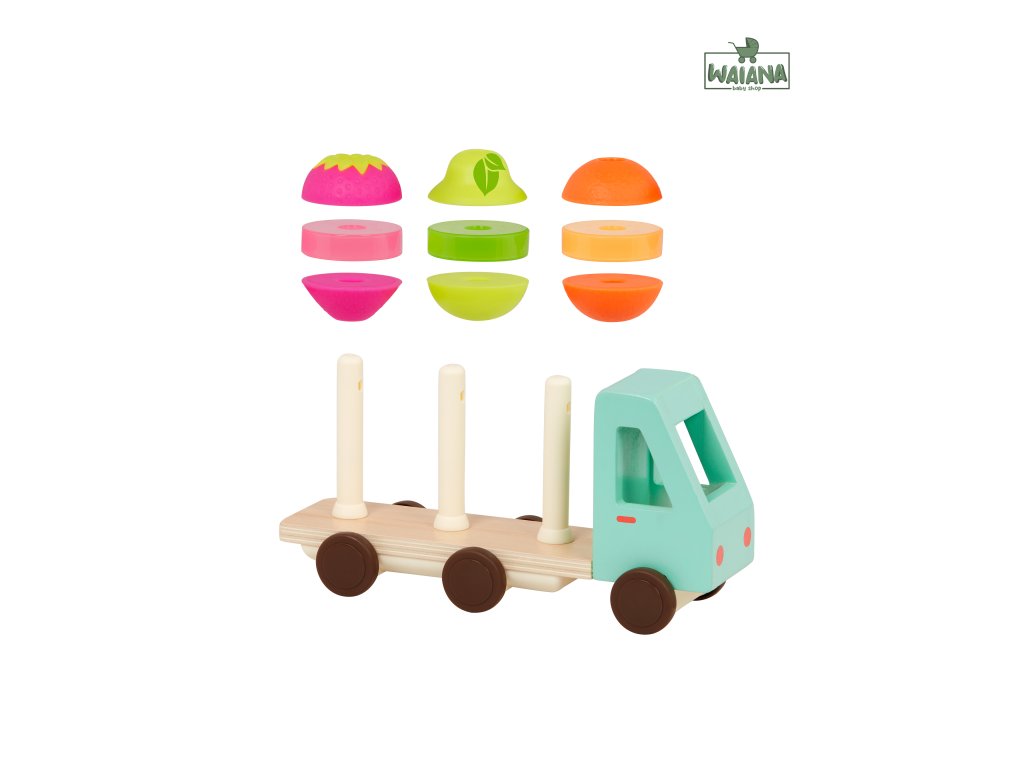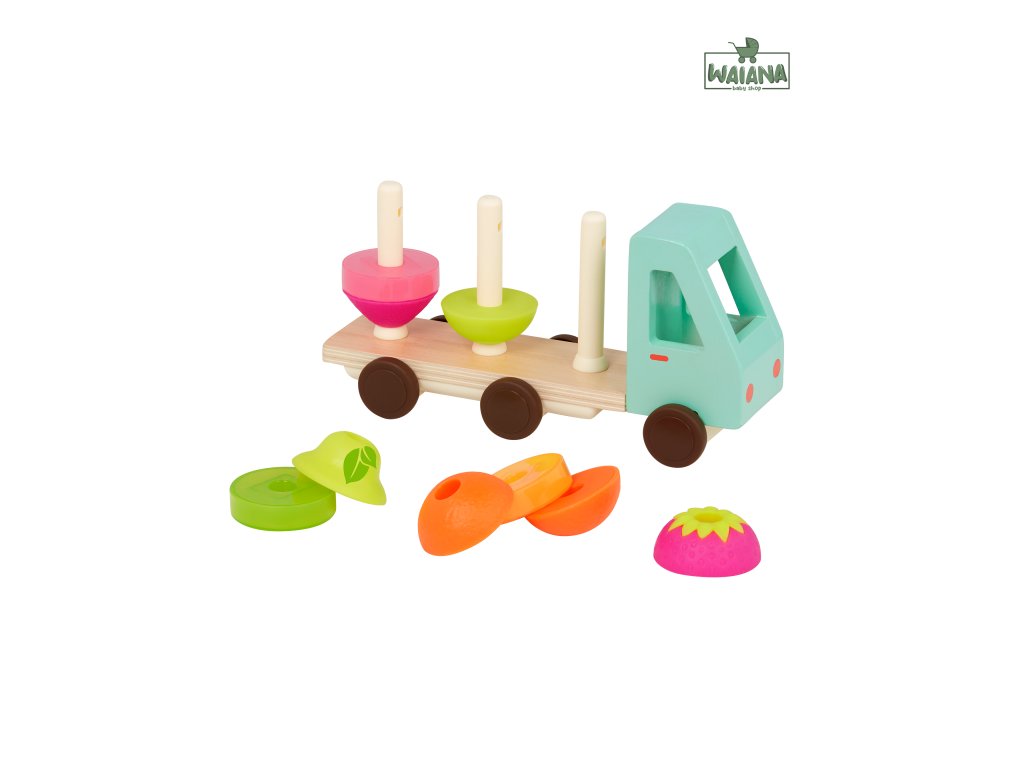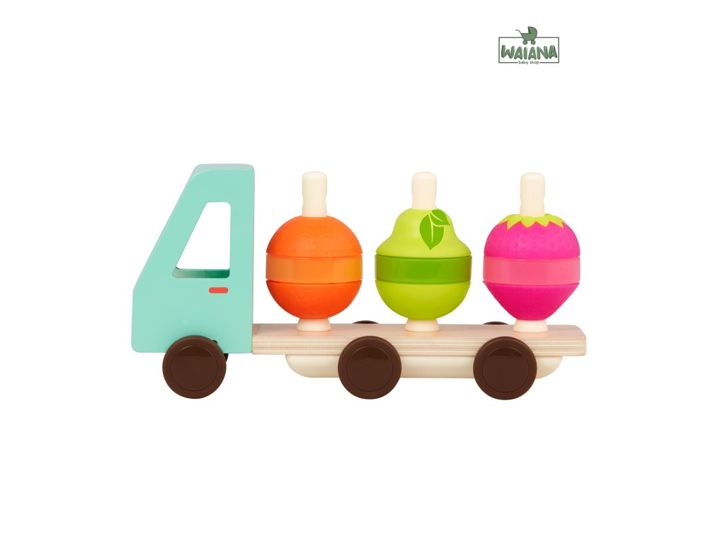 Nákladiak v krásnom drevenom prevedení vezie pomaranč, hrušku a jahodu, ktoré sa skladajú z 3 dielov. Dieťa ich skladá na seba podľa farby a tvaru.