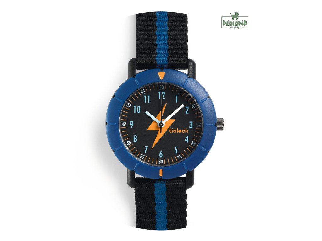 Náramkové športové ručičkové hodinky Ticlock: Modrý bleskOdolné detské ručičkové hodinkyHodinky kolekcie Djeco Ticlock sú ľahké, štýlové a zároveň odolné hodinky pre deti. Hodinky ponúkajú jasne čitateľný ciferník s číslami a ručičkami, otočný krúžok na meranie časových úsekov a spoľahlivý japonský strojček Miyota 2035, ktorý zabezpečuje tichý chod a presné meranie času.Prečo si vybrať hodinky Djeco Ticlockvodeodolnosť 5 ATM – sprcha a plytké plávanie (bez potápania)nárazuvzdornéobvodový krúžok poslúži na meranie časupohodlné nosenie – remienok z polyesteru, pracka z pevného plastubatéria už osadená – hodinky sú pripravené hneď na používanieObsah balenia1× náramkové hodinky s batériounávod