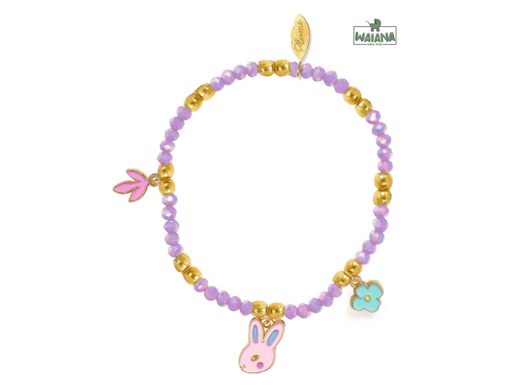 Náramok Rose Korálkový náramok, ktorý sa navlieka sám: bez zapínania a bez trápeniaNáramok Rose je farebný náramok z akrylových korálok, doplnený o tri smaltované prívesky (zajačik, list, kvietok) a zlatý detail. Dvojitá elastická niť zvyšuje odolnosť a uľahčí nasadenie.Rýchly prehľad odporúčaný vek: od 3 rokov rozmer: priemer náramku cca 6 cm zapínanie: bez zapínania (elastická niť)Obsah balenia 1× náramok