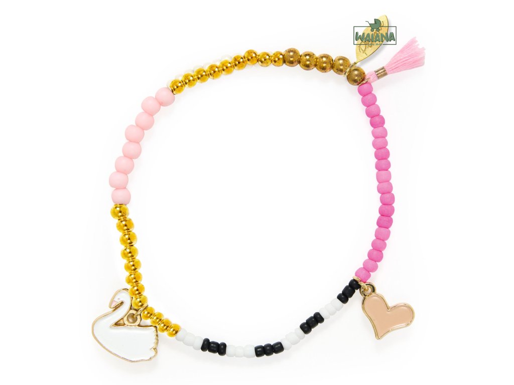 Náramok Swann Baletný šarm na zápästí: korálky, labuť a srdce bez zapínaniaNáramok Swann je jemný detský doplnok inšpirovaný svetom tanca. Farebné akrylové korálky dopĺňajú 2 smaltované kovové prívesky (labuť a srdce) a bavlnený strapec s brmbolcom, ktorý šperku dodáva hravý pohyb. Vďaka dvojitej elastickej niti sa náramok ľahko navlieka a pohodlne drží – bez potreby zapínania.Rýchly prehľad odporúčaný vek: od 3 rokov rozvíja: estetické cítenie, sebavyjadrenie, jemnú motoriku pri obliekaní v balení: 1× náramok s korálikmi, 2 príveskami a strapcomPrečo si ho deti zamilujú baletný motív – labuť a srdiečko pôsobia nežne a elegantne bez zapínania – stačí navliecť na ruku dvojitá elastická niť – odolnejšie a príjemné na nosenie strapec s brmbolcom – hravý detail, ktorý pekne vynikneObsah balenia 1× náramok s akrylovými korálikmi 2× smaltovaný kovový prívesok (labuť, srdce) 1× bavlnený strapec s brmbolcomTechnické parametre materiál: akryl, bavlna, smaltovaný kov priemer náramku: cca 6 cm rozmery balenia: cca 14 × 5,5 × 1 cm