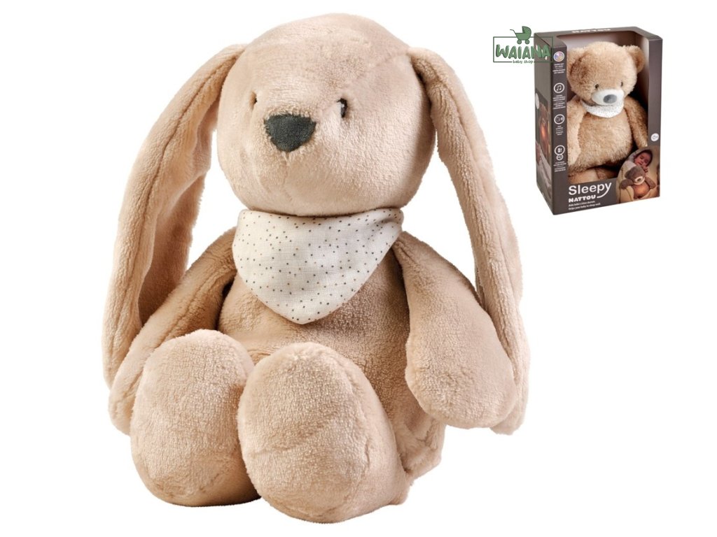 Zajačik na spanie Nattou je krásnej mäkkej kvality s príjemnou výplňou. Spiaci zajačik má v brušku svetielko, ktoré sa môže meniť medzi siedmimi farbami a zvukom, s bielym šumom, morom, tlkotom srdca a dvoma upokojujúcimi uspávankami, ktoré pomáhajú zabezpečiť pokojný spánok. Zvuky spiaceho zajačika sa aktivujú automaticky, keď započuje plač dieťaťa a zvuky automaticky prestanú po 15 minútach. Svetlo spiaceho zajačika vychádza z LED diódy v brušku, takže svetlo je tlmené textíliou zajačika a neprehrieva sa, teda svetlo môže bez problémov svietiť celú noc.