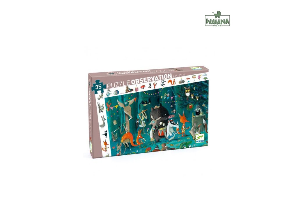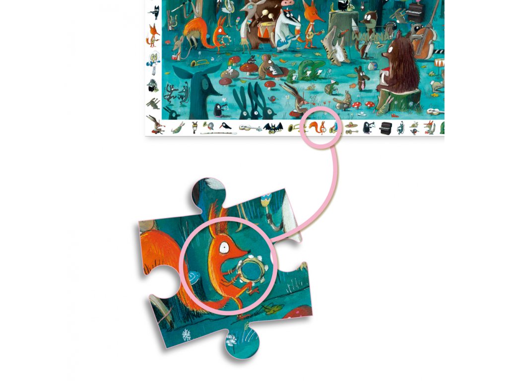 Čože sa to v lese deje? Bohato ilustrované 35-dielikové puzzle s plagátom, ktoré po doskladaní umožňuje ďalšiu aktivitu: hľadanie detailov podľa obrázkov na okraji.Puzzle s množstvom detailov na objavovanie. Znie tu hudba, znie tu spev, zo zvieratiek je orchester! Pozri kto hrá na gitare a kto búši na bubon. Súčasťou balenia je aj identický plagát rovnakých rozmerov, ktorý poslúži ako podložka i pomôcka pri skladaní.Počet dielikov: 35Rozmery puzzle: 61 x 38 cm