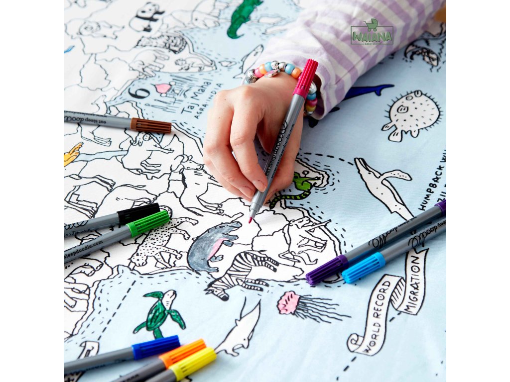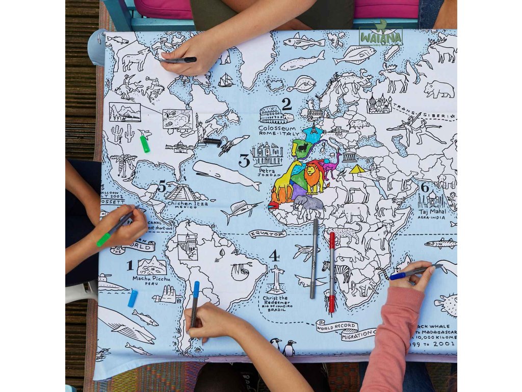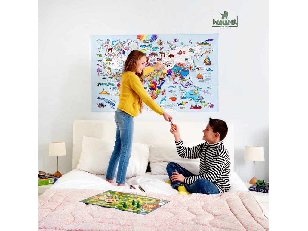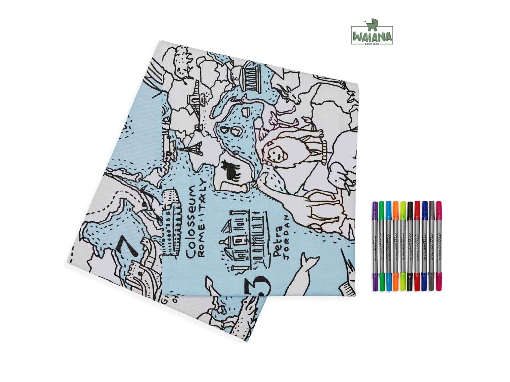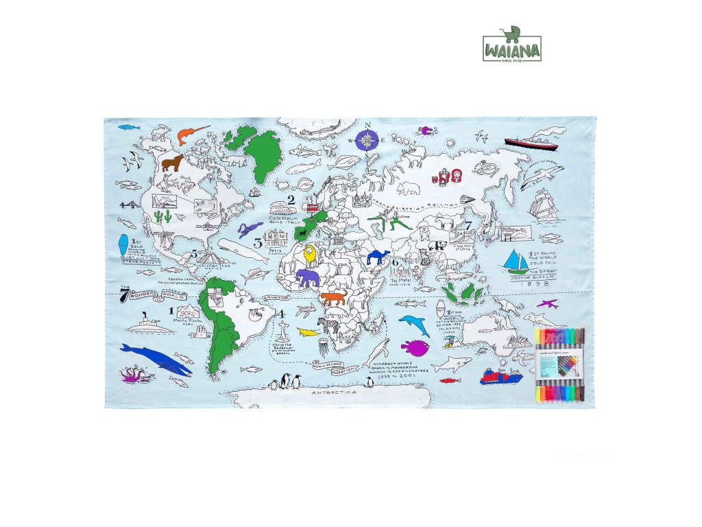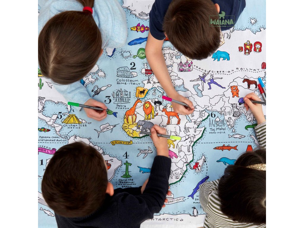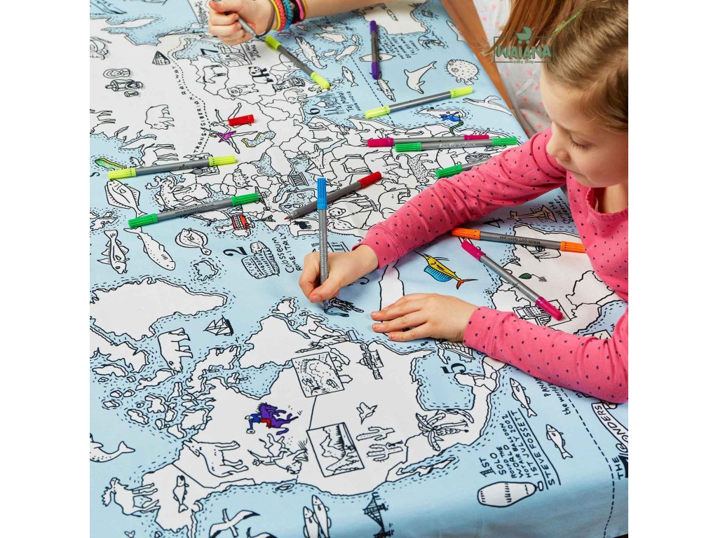 Obrus na vyfarbenie World map Vymaľuj a operZábavné učenie o zvieratách a miestach na mapeS týmto originálnym obrusom si deti nielen užijú kreatívne vyfarbovanie, ale aj spoznajú svet okolo seba. Na mape nájdu rôzne krajiny, oceány a zvieratá, ktoré môžu oživiť farbami podľa vlastnej fantázie. Tento stopercentne bavlnený obrus s mapou sveta je skvelý darček, ktorý pomôže deťom rozšíriť ich vedomosti o svete a zvýši ich záujem o cestovanie. Deti sa môžu zabaviť plánovaním svojej ďalšej vzrušujúcej dobrodružnej cesty pomocou kontinentov. Je to skvelý nápad na party v štýle „okolo sveta“ a ideálne na dekorácie s cestovateľskou tématikou alebo na vzdelávacie aktivity doma. Dokonca má aj očká, takže môže slúžiť ako zábavná nástenná dekorácia!Prečo je World map obrus jedinečný?Spája zábavu, tvorivosť a vzdelávanieVyrobené z udržateľnej bavlnyObsahuje 10 umývateľných fixiekOpakovane použiteľné – stačí vyprať a tvoriť znovaSkvelý darček pre deti, ktoré milujú geografiu a cestovanie