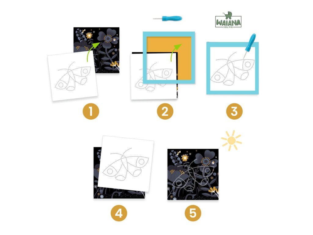 Odhalenie obrázkov Dierkovanie pre predškolákov Zábavná motorická aktivita Vitajte vo svete tvorivej zábavy a objavovania! S touto jedinečnou sadou na dierkovanie pre predškolákov si deti môžu samy vytvoriť obrázky, ktoré ožijú, keď za ne umiestnite svetlo. Stačí si vybrať pozadie a zvieratko, upnúť hárky do šikovného držiaka a pomocou špeciálneho nástroja dierkovať podľa predlohy. Keď sa na obrázok pozriete proti svetlu, objaví sa skryté zvieratko – hotové kúzlo! Táto aktivita je inšpirovaná Montessori metódou a pomáha deťom rozvíjať jemnú motoriku, sústredenie a presnosť. Navyše sa učia používať nový nástroj bezpečne a s rôznou intenzitou tlaku. Všetko je doplnené názornou obrázkovou brožúrou, ktorá deti vedie krok za krokom bez nutnosti čítať. Sada je ekologická (vyrobená z kartónu a papiera s certifikátom FSC®), zábavná a zároveň vzdelávacia – ideálny darček alebo doplnok do predškolskej triedy.