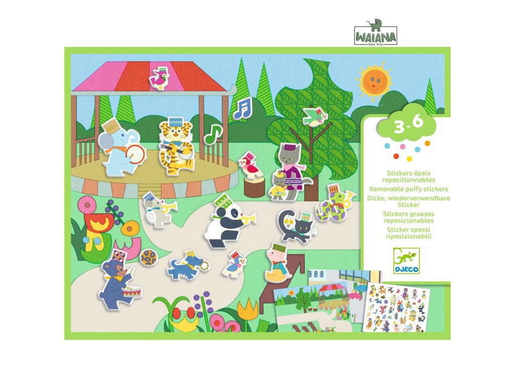Odnímateľné samolepky Hudobný sprievod Oživ hudobný sprievod: nalepuj, prelepuj a vymýšľaj nové príbehyOdnímateľné samolepky – Hudobný sprievod sú kreatívna sada, vďaka ktorej si deti vytvoria vlastné veselé scény plné hudby. V balení nájdu 2 veľké ilustrované pozadia, ktoré môžu dopĺňať a meniť pomocou opakované použiteľných „nafúknutých“ (puffy) samolepiek.Samolepky sa dajú jednoducho odlepovať a znovu nalepovať, takže dieťa môže sprievod zakaždým usporiadať inak – raz pochoduje kapela, inokedy sa pridajú diváci, nástroje a ďalšie detaily. Hrubšie samolepky sú príjemné na uchopenie a skvelo sa hodia aj pre menšie detské ruky.Pre koho je vhodná: odporúčaný vek: 3 – 6 rokovObsah balenia 2 veľké ilustrované predlohy (cca 21 × 29,5 cm) 30 opakovane použiteľných hrubých puffy samolepiek