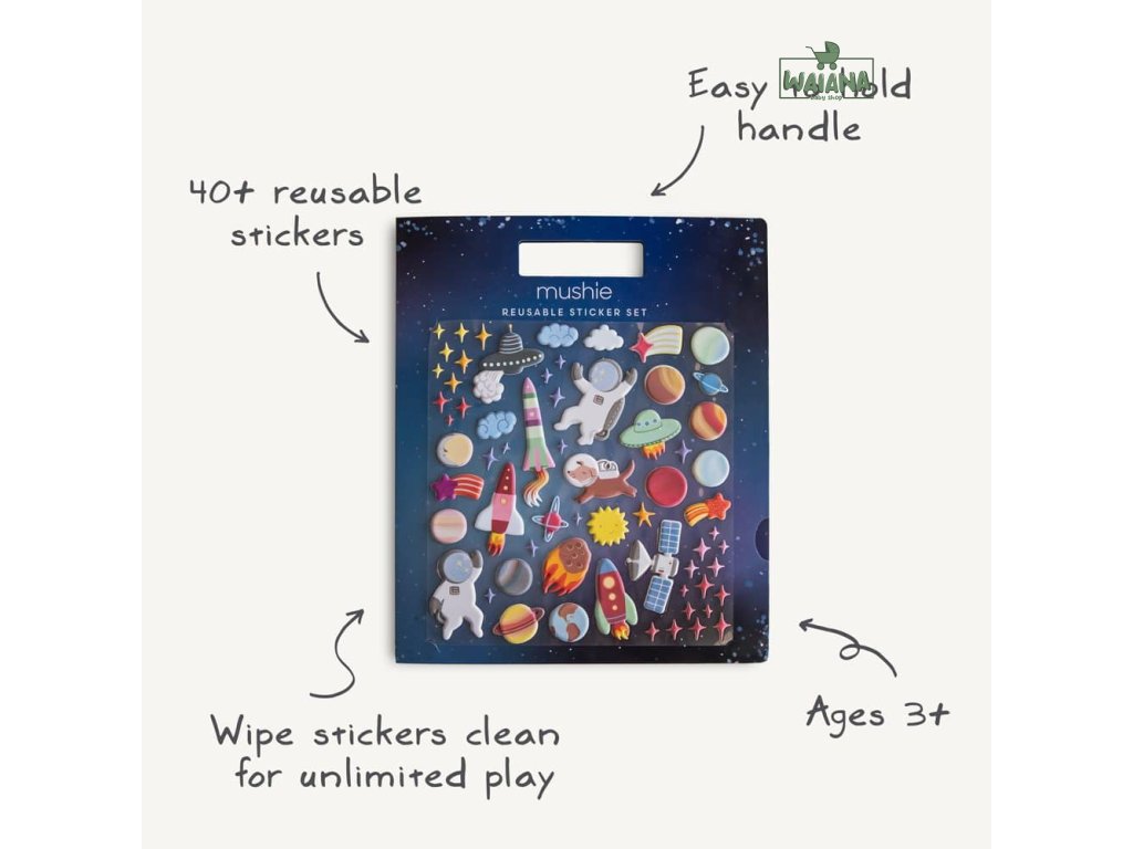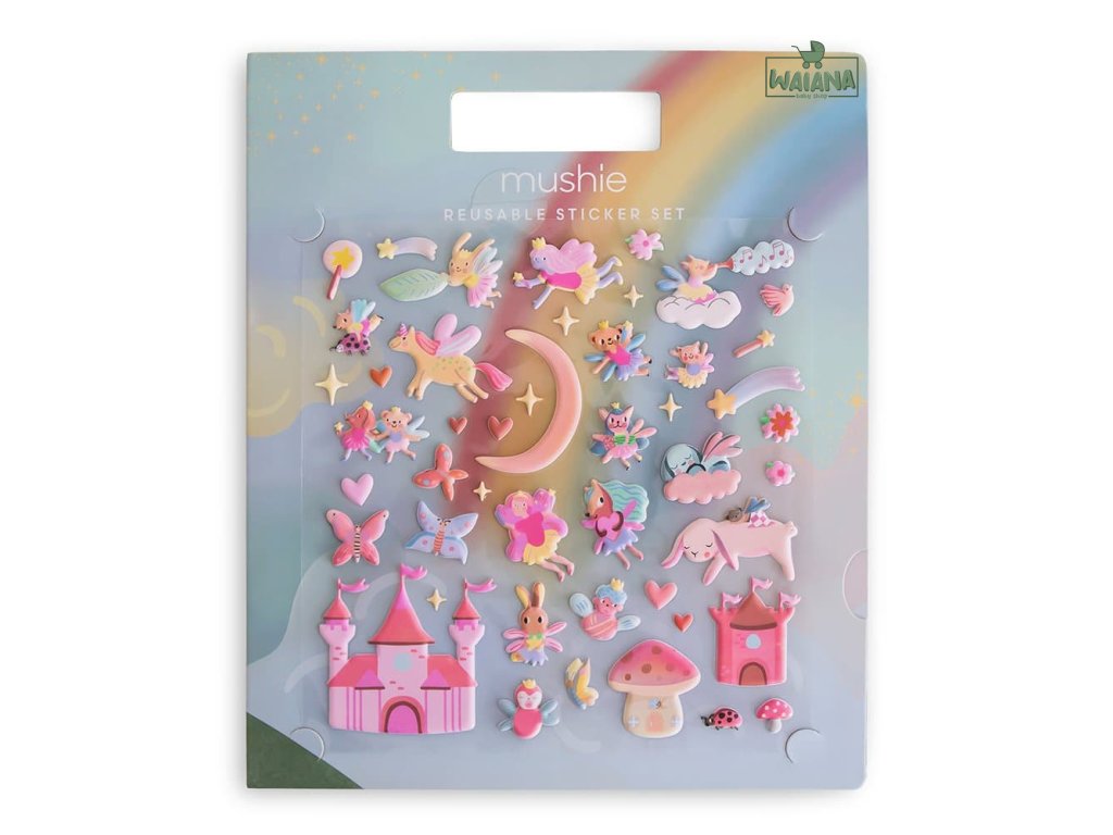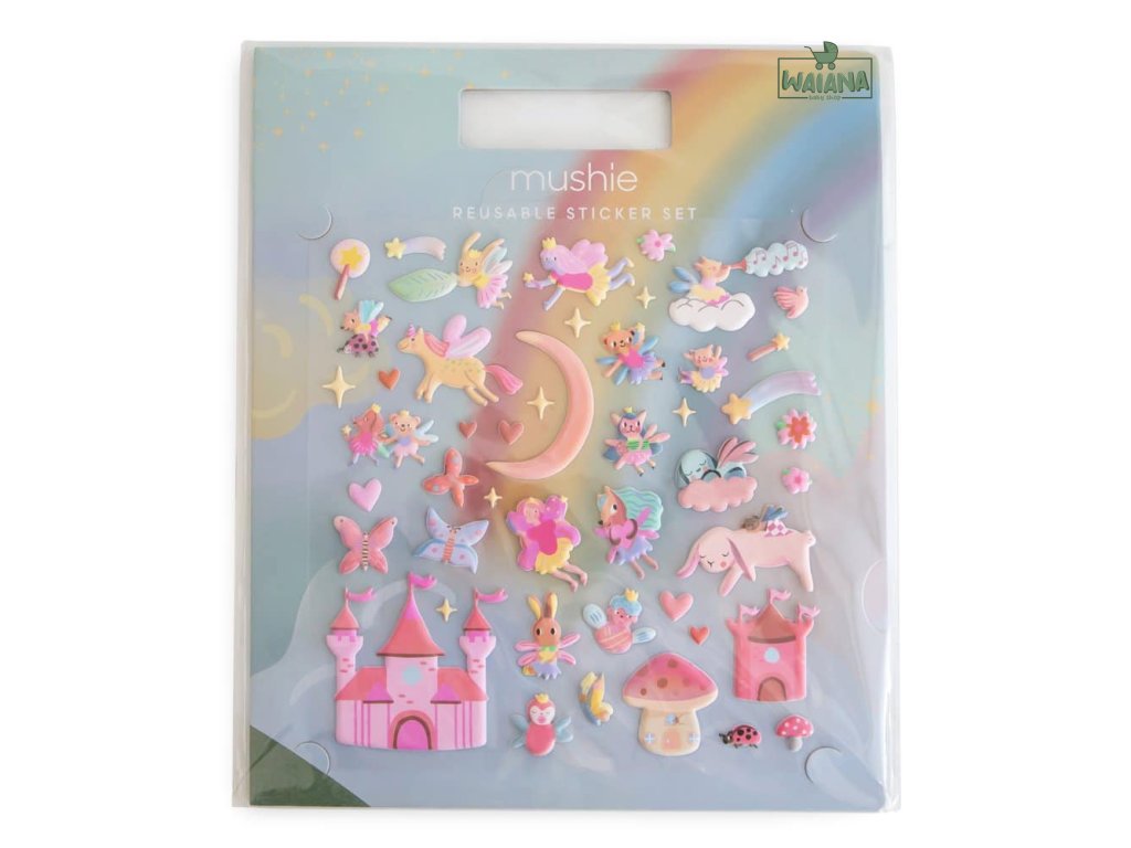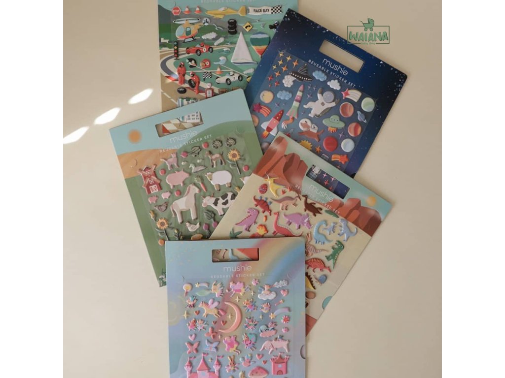 Mushie sada znovupoužiteľných nálepiek – detaily- Obsah balenia: 1× knižka s nálepkami