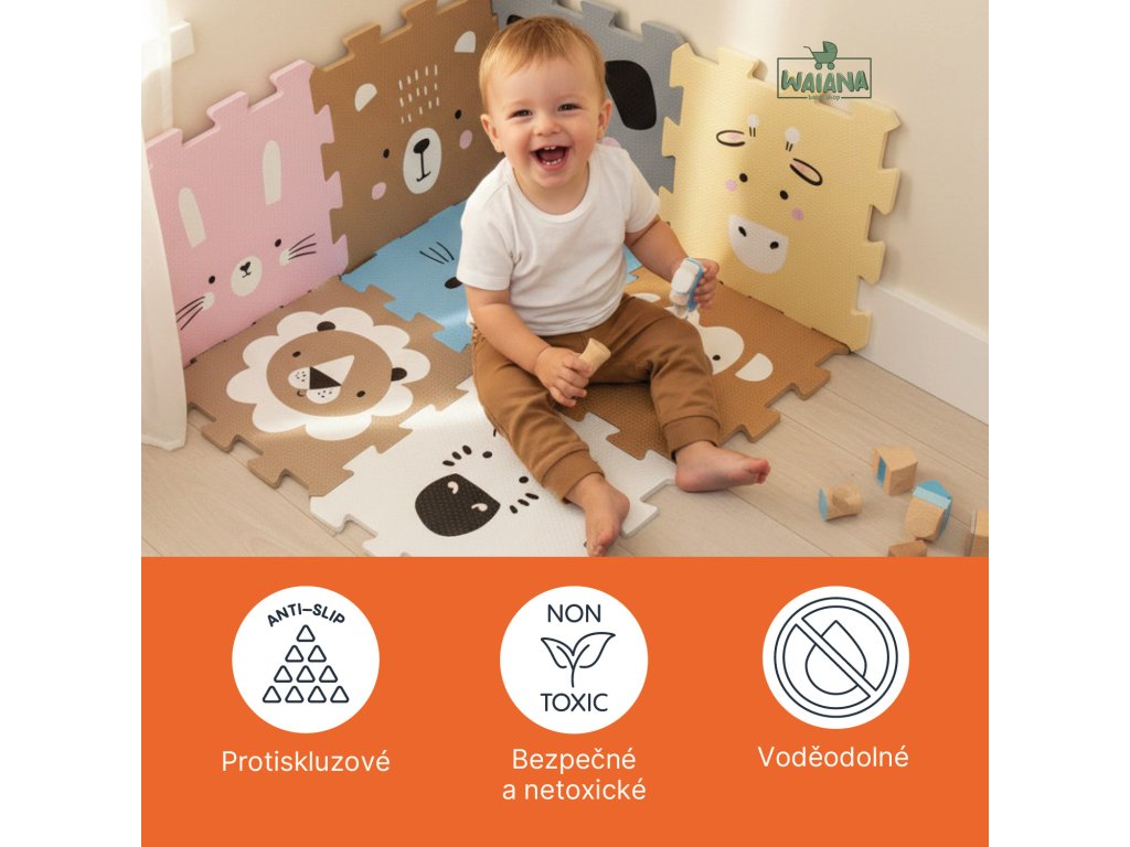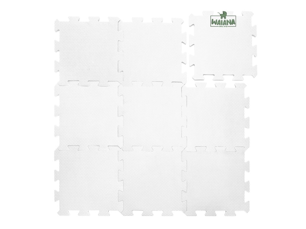 Jednotlivé dlaždice 30 × 30 cm (9 ks) do seba perfektne zapadajú. Podložka je vhodná pre deti od narodenia, vyrobená z nezávadného a príjemného materiálu.