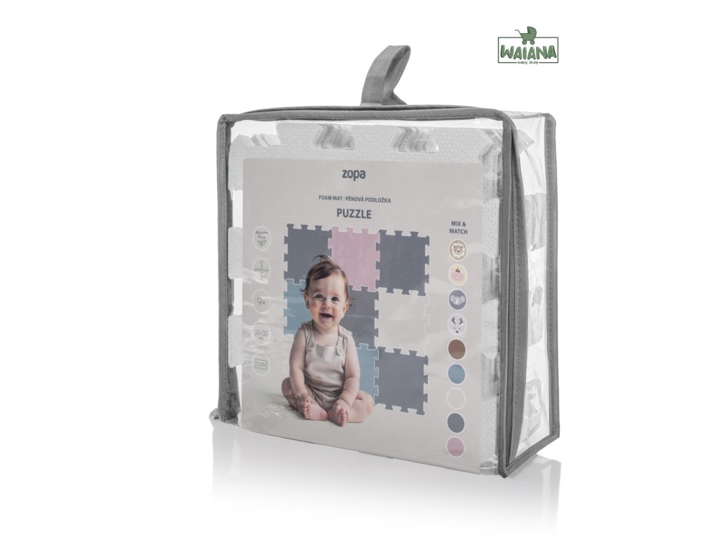 Penové puzzle je vyrobené z kvalitnej EVA peny. Slúži nielen ako podložka, ktorá zabezpečí pohodlie vďaka izolácii od chladu, ale aj ako praktická pomôcka pre prvé mesiace bábätka, keď poskytuje mäkkú oporu pri pásení koníčka alebo pri prvom lození.