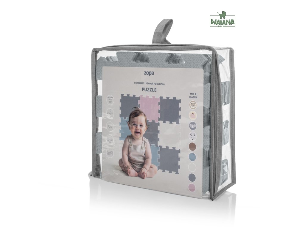 Penové puzzle je vyrobené z kvalitnej EVA peny. Slúži nielen ako podložka, ktorá zabezpečí pohodlie vďaka izolácii od chladu, ale aj ako praktická pomôcka pre prvé mesiace bábätka, keď poskytuje mäkkú oporu pri pásení koníčka alebo pri prvom lození.