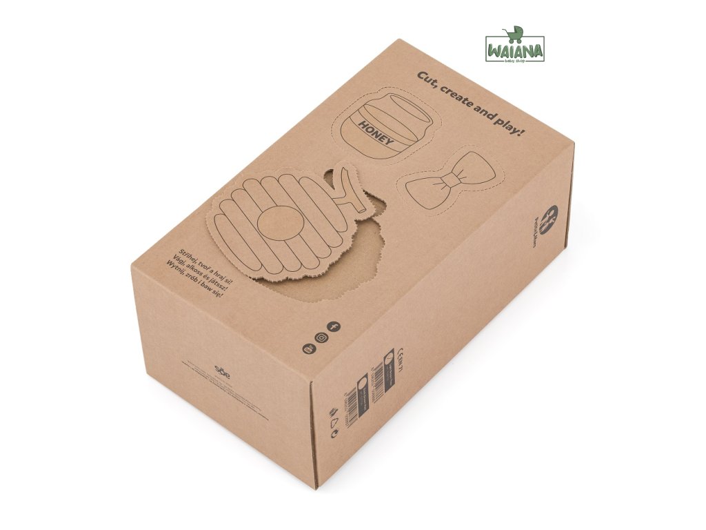 Naše plyšové zvieratká sú balené v krásnych ekologických krabičkách, ktoré majú zaujímavé využitie. Hracie doplnky sú vytlačené na zadnej strane každej krabičky a vďaka perforácii sa dajú ľahko vystrihnúť. Krabičku možno použiť aj ako domček pre plyšových medvedíkov.