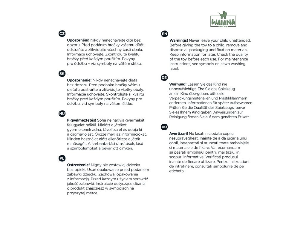 Nikdy nenechávajte dieťa bez dozoru. Pred podaním hračky vášmu dieťaťu odstráňte a zlikvidujte všetky obaly. Informácie uschovajte. Skontrolujte kvalitu hračky pre každým použitím.