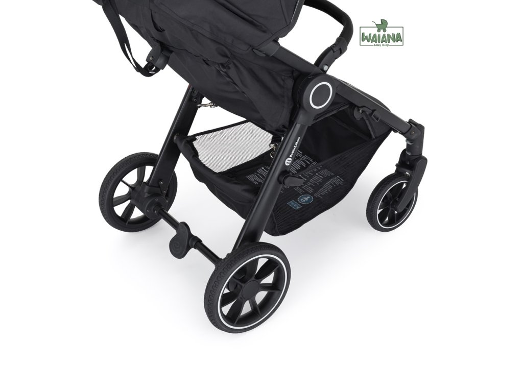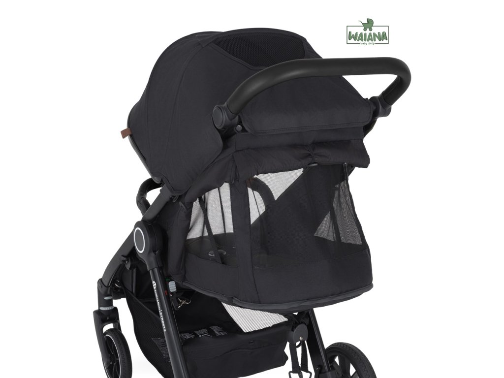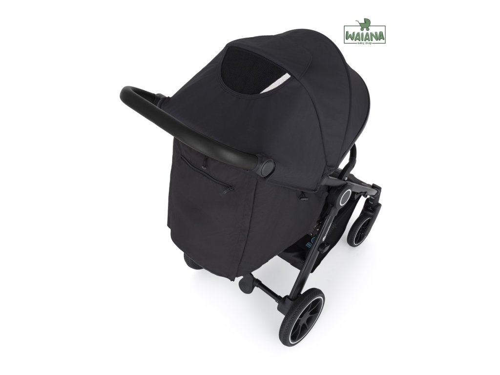 Športový kočík Street2 RWS Black je vďaka menším kolieskam ľahší, celogumené kolieska majú ale napriek tomu výborné jazdné vlastnosti. Madlo a rukoväť sú v čiernej farbe.
